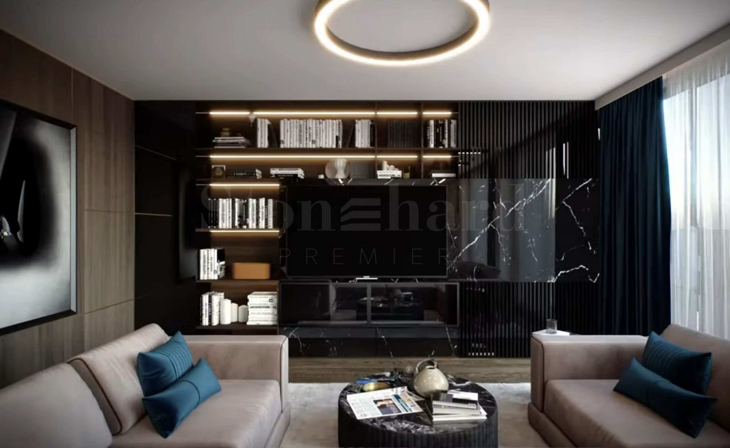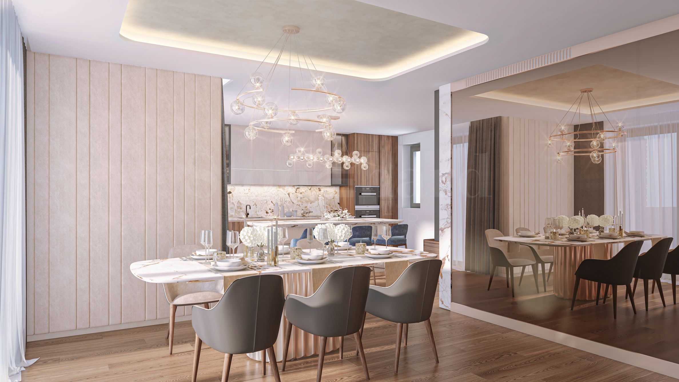 • Elegant lobby, covered in natural marble, furnished with upholstered furniture by Bentley Home, accented with green lampshades and a spectacular fireplace;