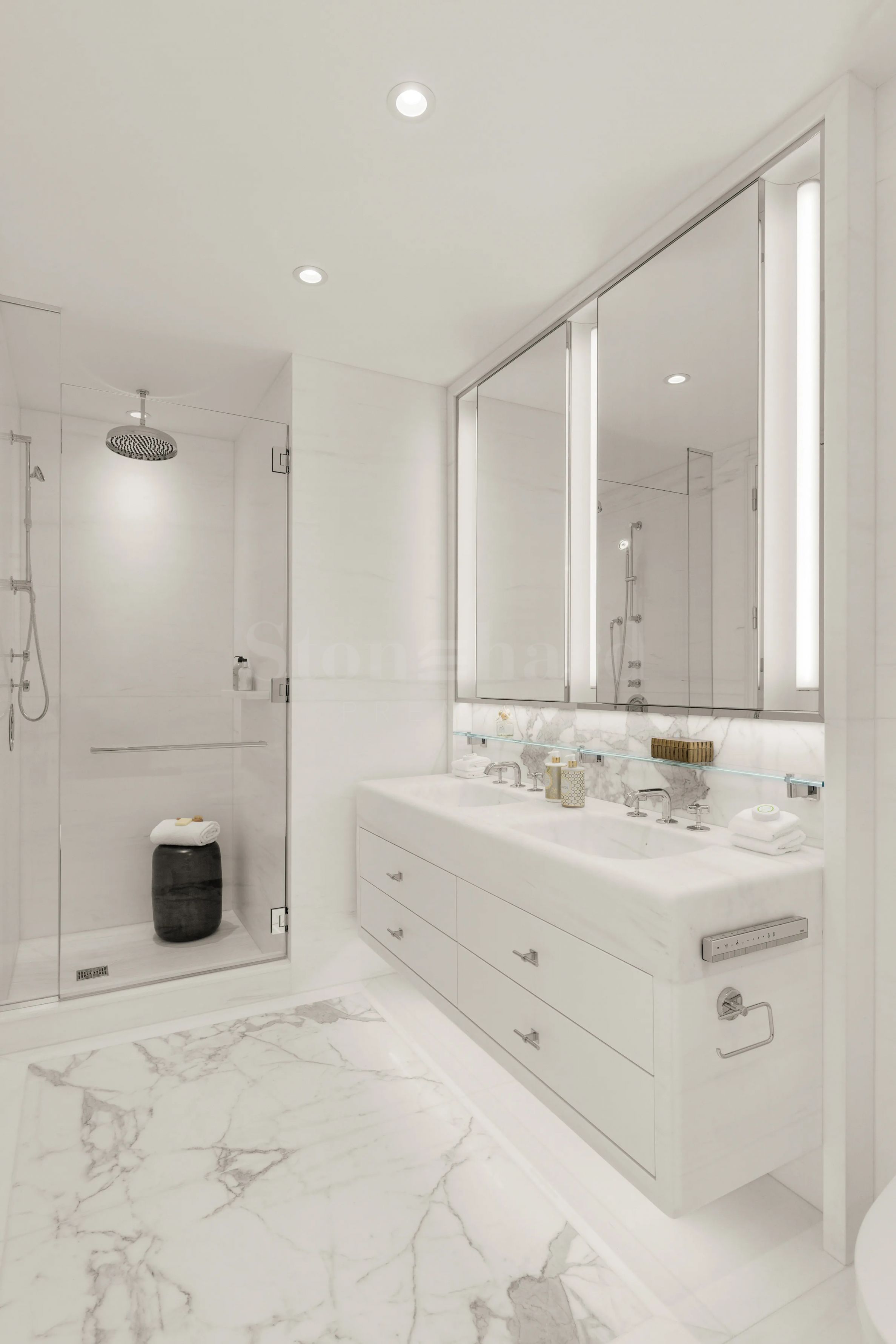 The bathrooms feature fine Bianco Dolomiti marble, complemented by Calacatta Gold accent panels arranged in a mirrored style for a dramatic visual effect. The sinks are carved from whole marble blocks – a true work of art in stone.