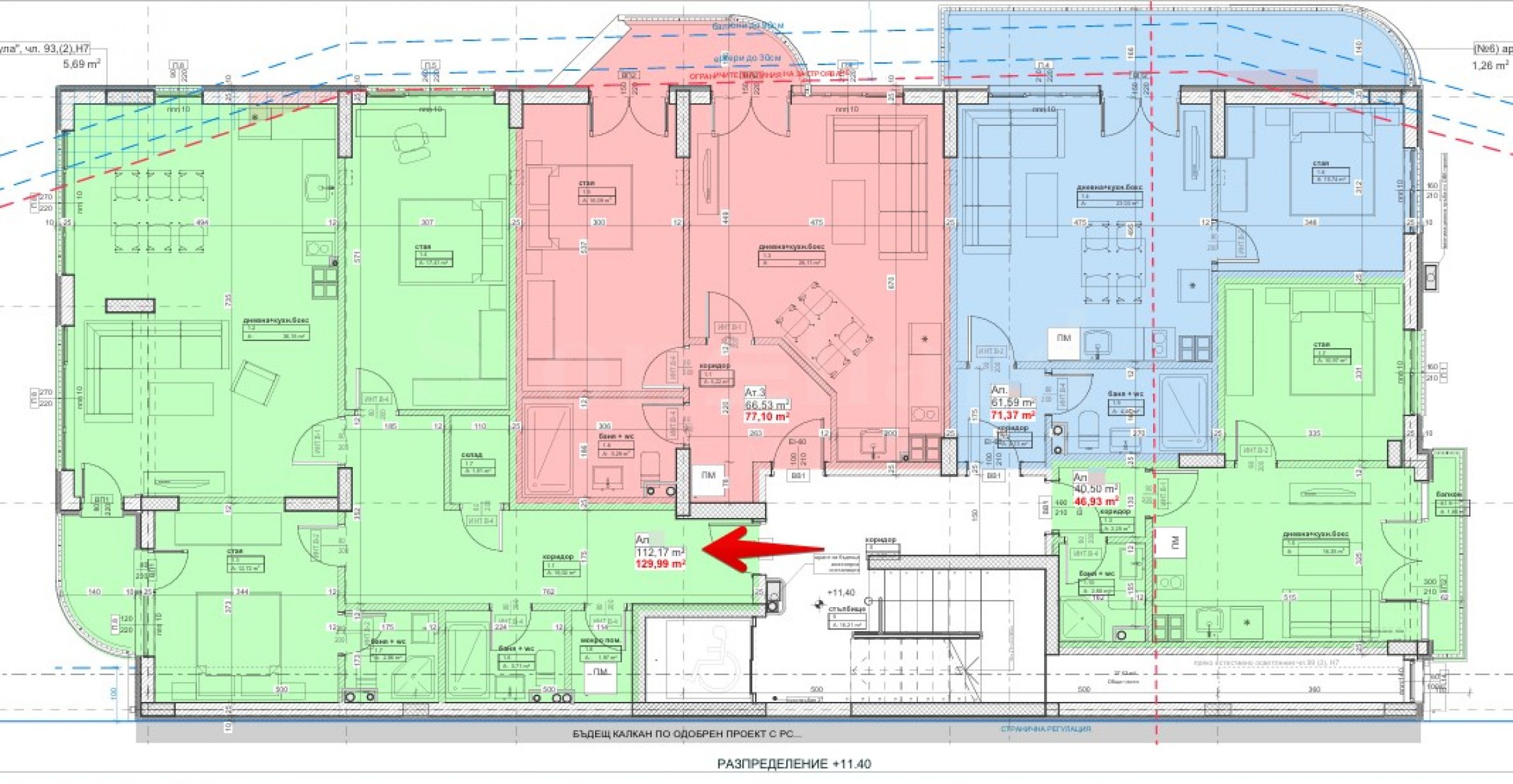 The property is located on the 3rd floor and has a total area of 129.99 m2., net area - 112.17 m2. It consists of an entrance hall/corridor, bathroom with toilet, storage room, utility room, living room with kitchen and dining room, terrace, bedroom with private bathroom and access to a terrace from the living room, second bedroom. It is offered in a degree of completion according to BDS. The heating is solved with gas heating, as well as a built-in air conditioning installation for a multi-split system.