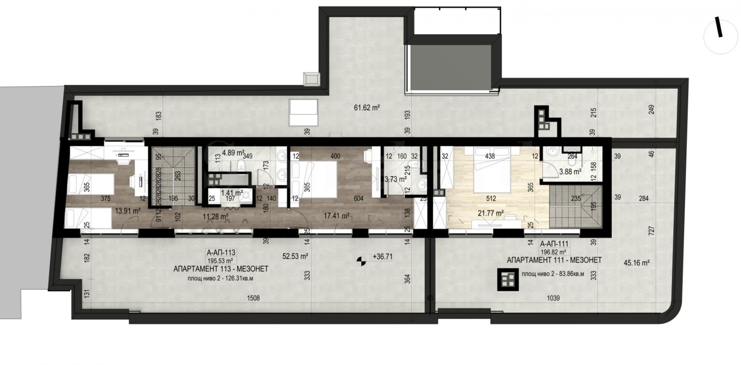 • Total area – 224.88 m2 (built-up area – 195.32 and 29.56 m2 – ideal parts of the common areas);