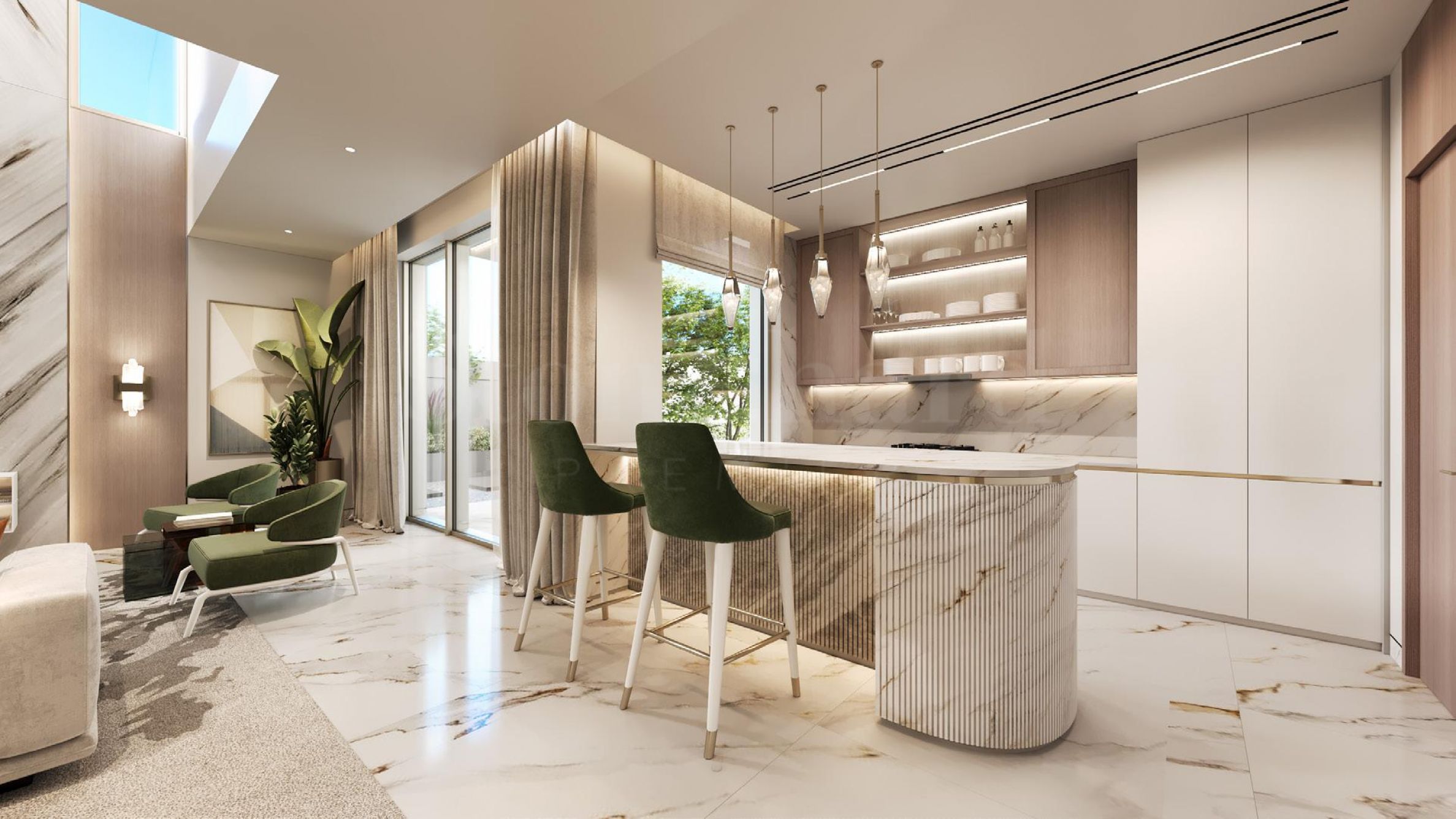 Neptune Interiors by Mouawad will offer you not just a house, but a true residence of glamour – a home created with uncompromising precision, attention to every detail and inimitable style. These are spaces transformed into the stage of your life, where every day you will shine with elegance and exclusivity. With an area of 381.60 sq m, located on a plot of 300 sq m, the property impresses with a feeling of airiness, freedom and spaciousness. The floor-to-ceiling windows not only expand the spaces, but also invite sunlight to penetrate generously, illuminating every moment with a warm glow.