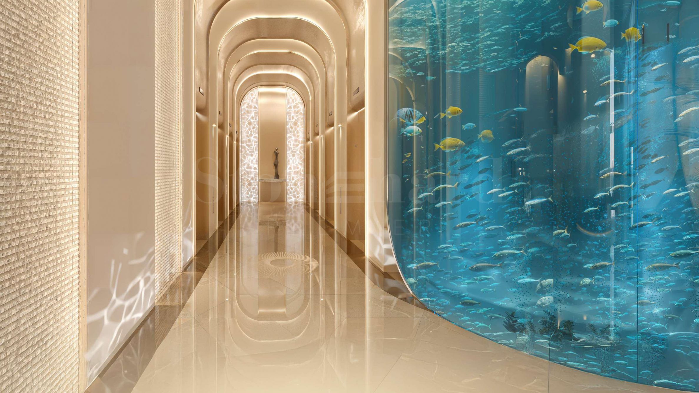 The Breez lobby welcomes you with an exceptional atmosphere – high ceilings, a water installation descending to a central fountain, artistic lighting and a unique reception desk resembling a sculptural work. An undoubted highlight is the impressive aquarium with an area of 140 sq m and a height of 6 meters – a living picture that adds a unique character.
