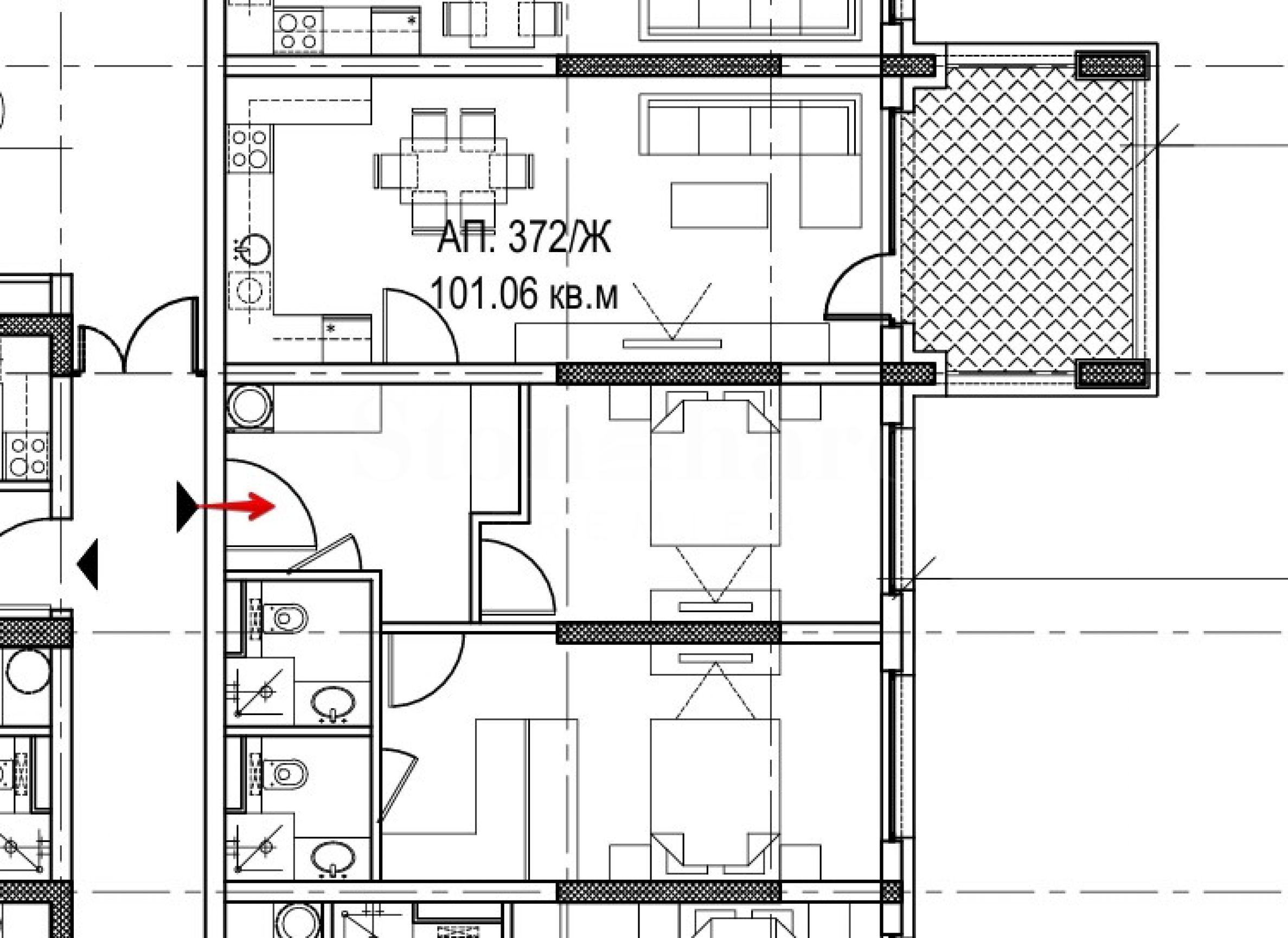 The property is located on the 4th floor and has a favorable south/west exposure. The apartment has a total area of 116.77 m2, net area - 101.06 m2, on which are distributed: entrance hall, bathroom/toilet, living room with kitchen and terrace, one bedroom with private bathroom, second bedroom. The property is being let in a degree of completion according to BDS, with five-chamber PVC joinery Rehau, with triple glazing and an armored entrance door.