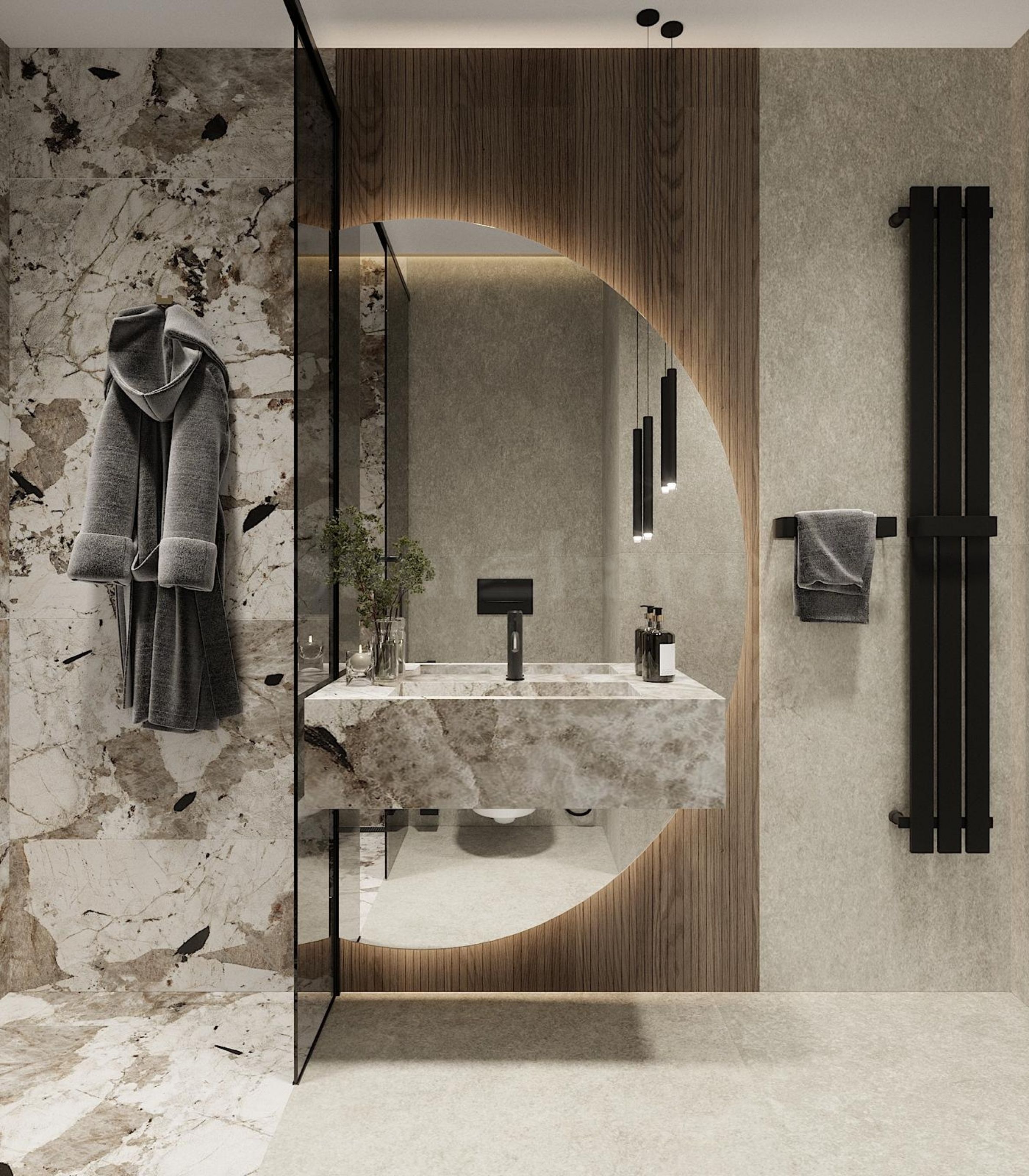 modern minimalism with a luxurious Scandinavian feel, neutral tones, high-end materials and precise LED lighting.