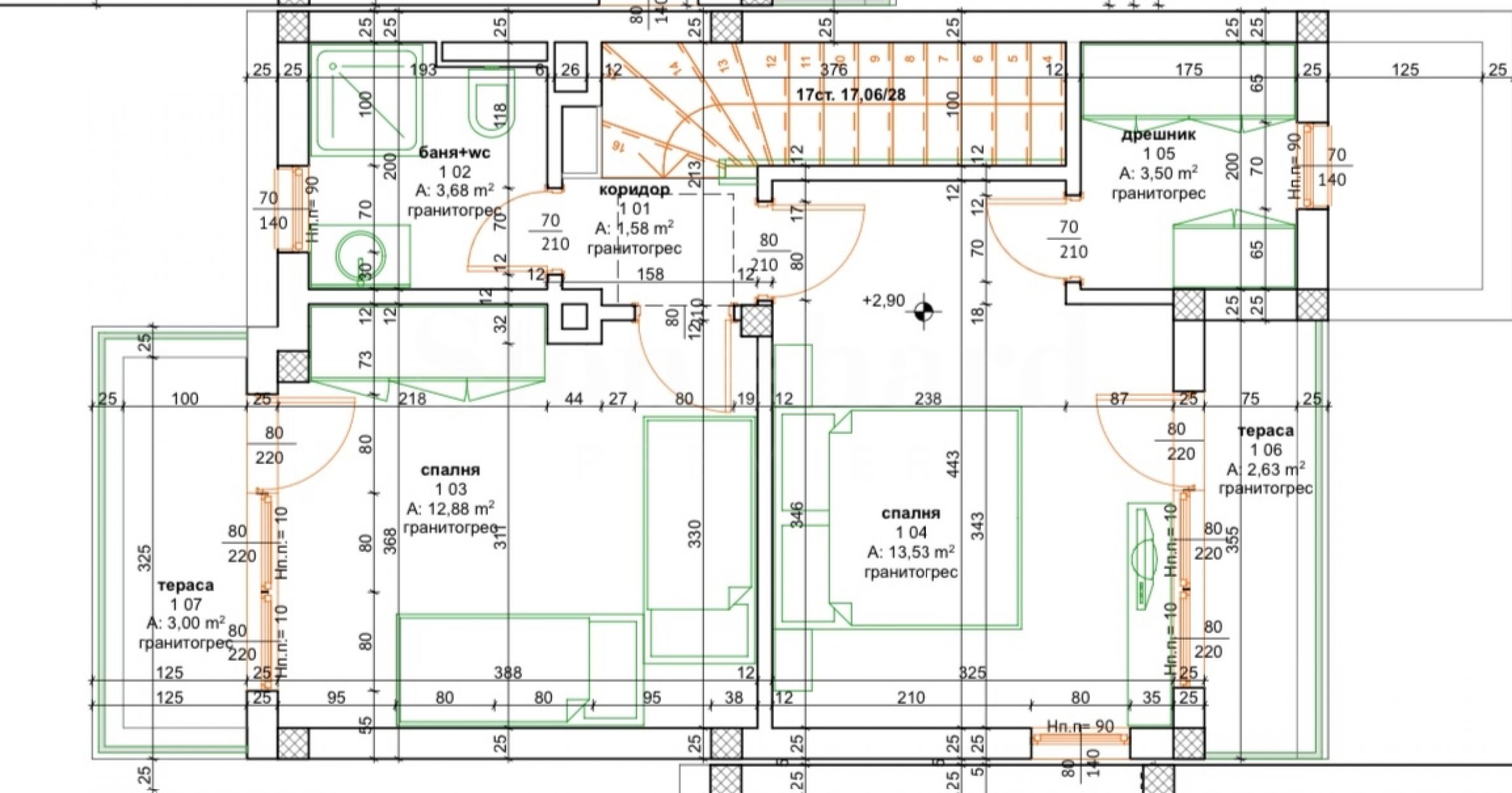 • interior walls: interior partition walls are made of solid single bricks 12 cm thick Phoroterm, ready-mix plastering on walls and ceilings, priming of ceilings; painting with Caparol latex - walls and ceilings - at least 2 times;