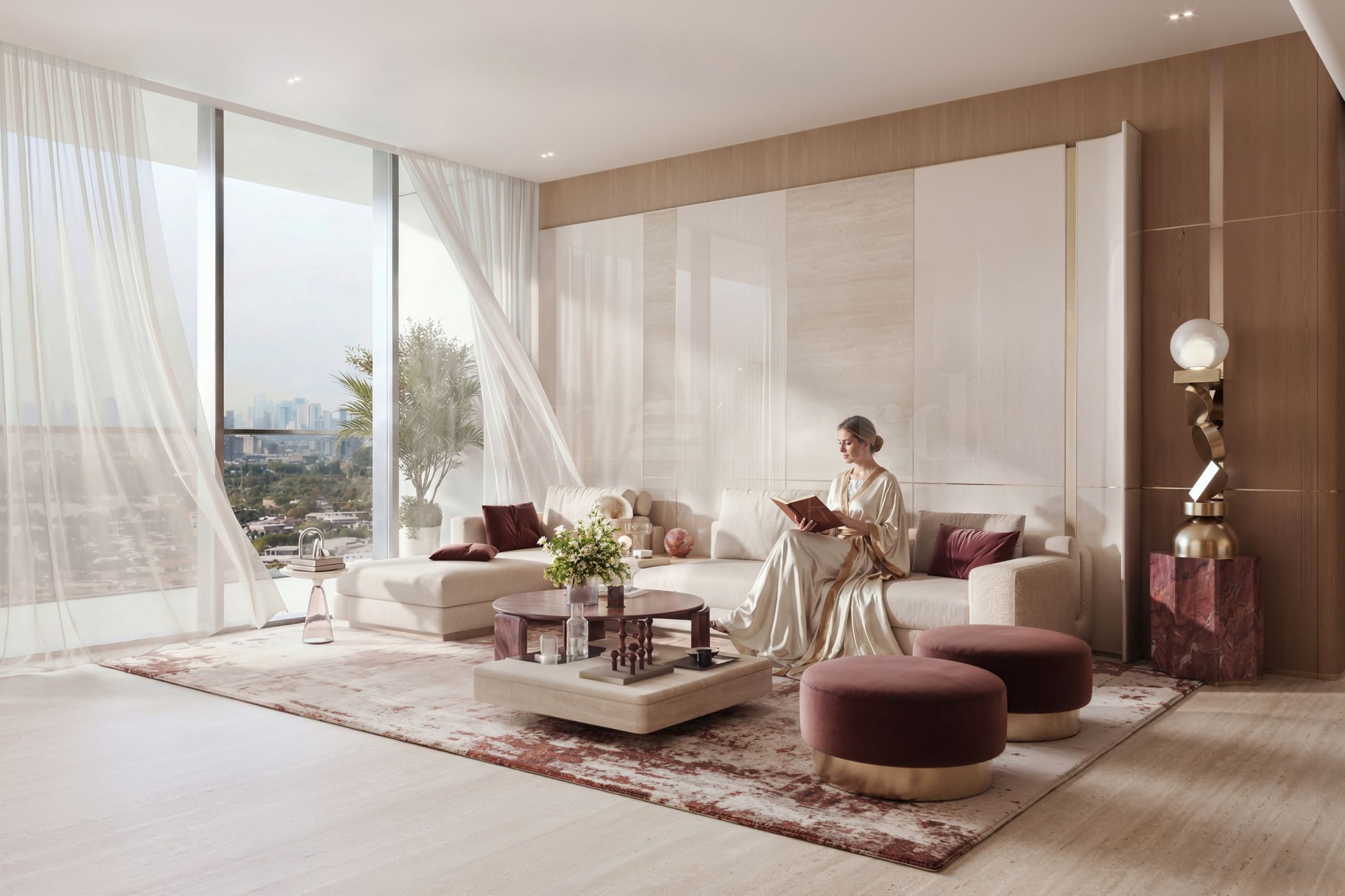 Binghatti Etherea rises 30 stories high and is carefully oriented to maximize natural sunlight, ensuring bright, airy, and inviting living spaces. Floor-to-ceiling windows not only give the façade a sleek, modern appearance but also create a sense of openness and a smooth connection between indoor spaces and the urban environment.