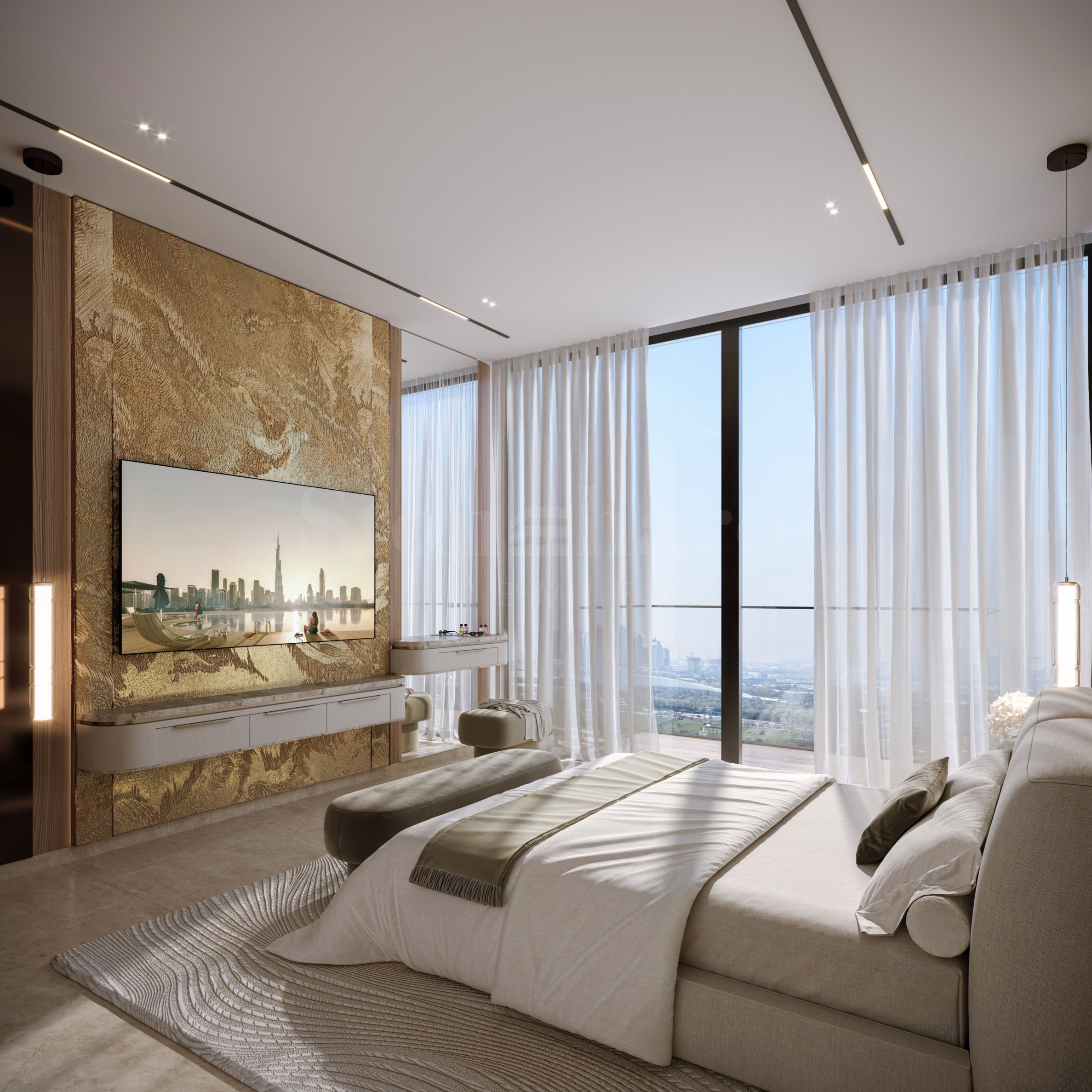 Binghatti Luxuria rises 30 stories and has three underground levels, providing convenient parking spaces for owners and their guests. The architectural appearance is emphasized by clean lines and contemporary aesthetics, and the facade lighting contributes to the impressive presence of the building at night. Panoramic floor-to-ceiling windows and high ceilings create a feeling of spaciousness and light in each apartment. The apartments are designed with attention to detail to ensure comfort and privacy, and the spacious sun terraces offer the opportunity to relax with a view of the environment and the richly landscaped spaces.