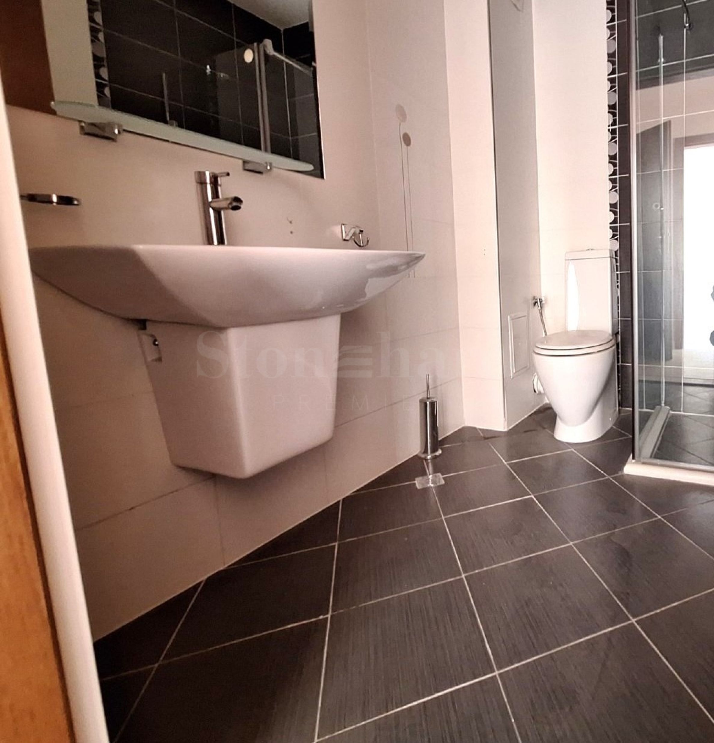 • Furnished bathroom with shower cabin and toilet.