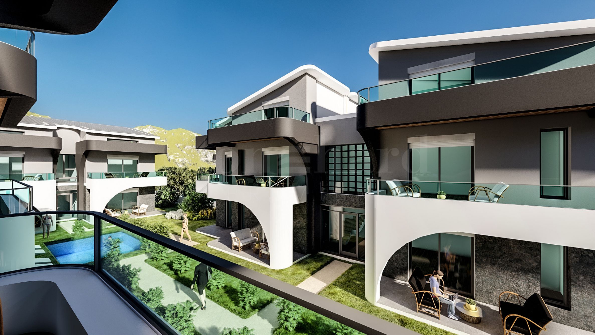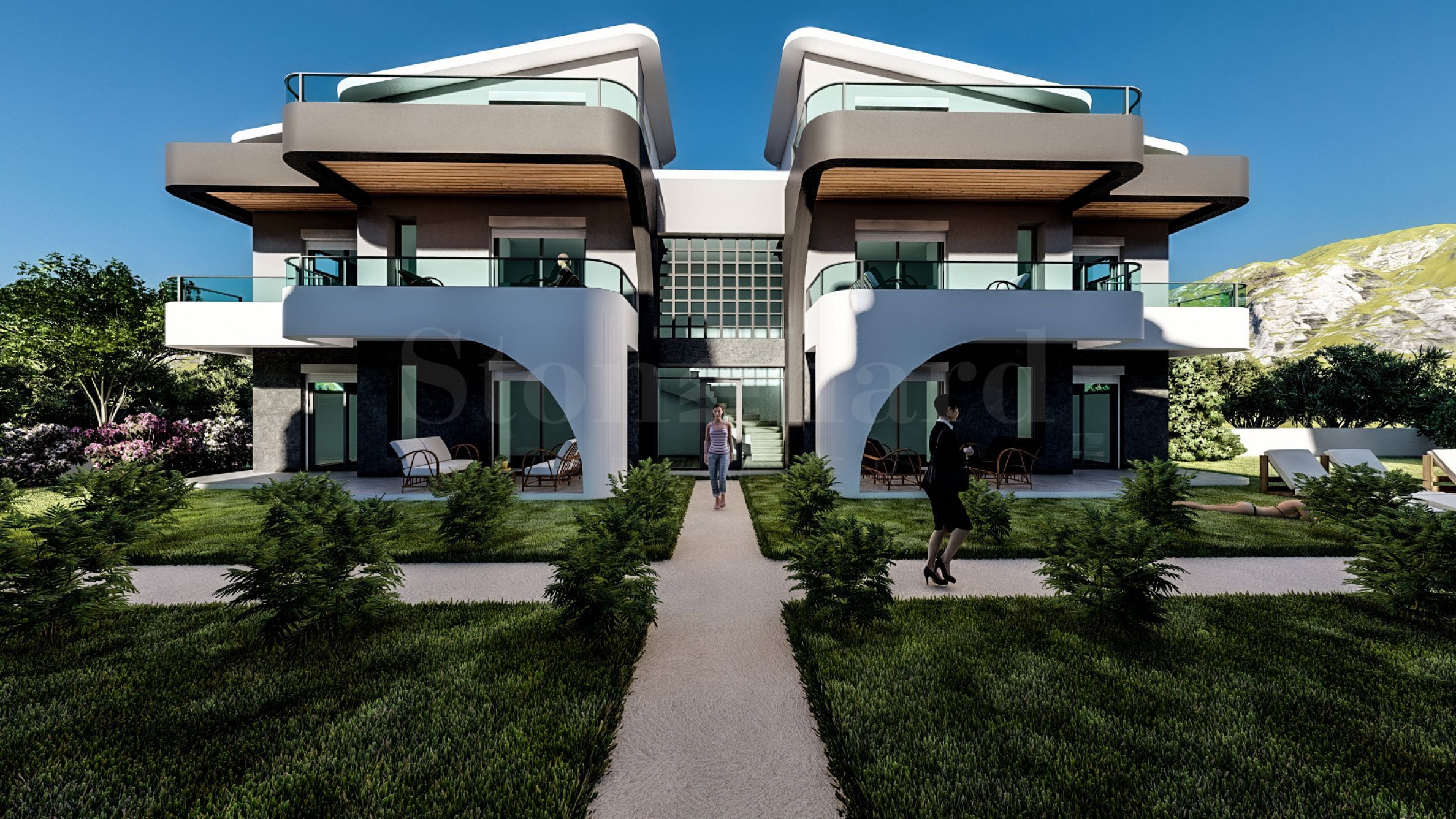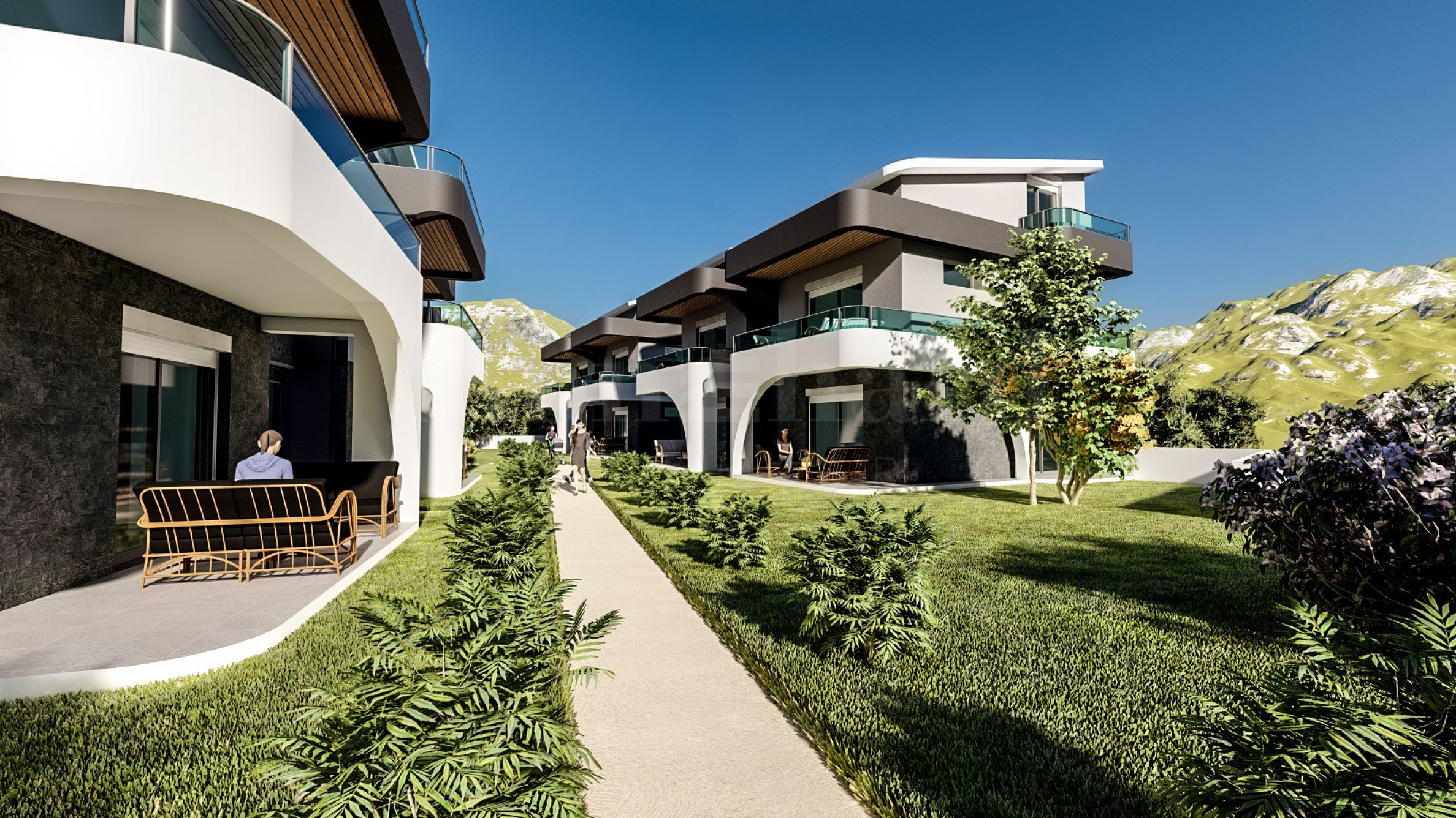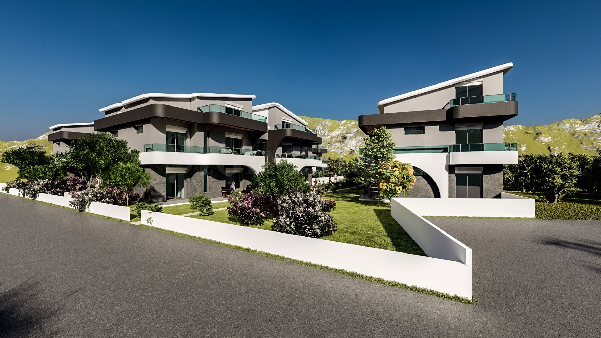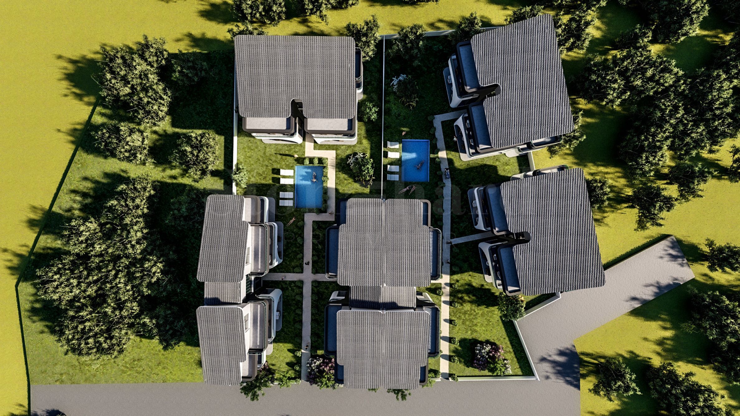 The complex consists of 8 buildings with a total of 24 apartments, thoughtfully designed to ensure comfort and functionality. The architecture features an elegant aesthetic, combining glass, wood, and decorative elements that create a contemporary character. The residences are arranged over one or two levels, connected by stylish internal staircases, and are delivered fully finished “turnkey,” including installed entrance and interior doors, flooring, lighting, fitted kitchens, and fully equipped bathrooms. Ground-floor units feature sunny verandas, while upper-level apartments offer spacious terraces.