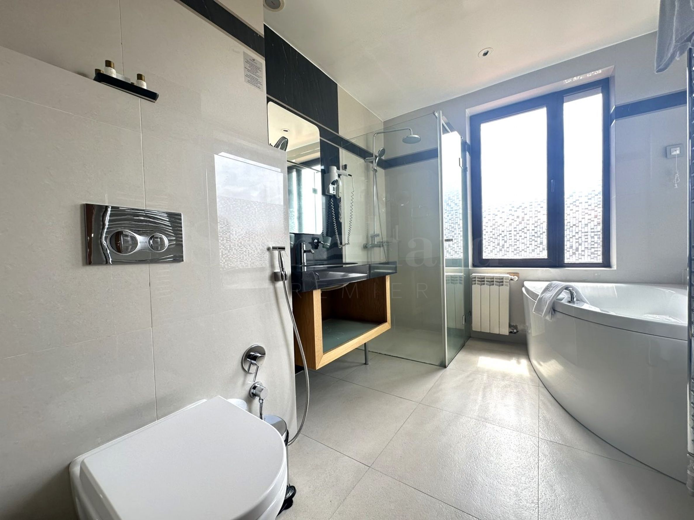 • Bathroom with bathtub, shower cabin and toilet;