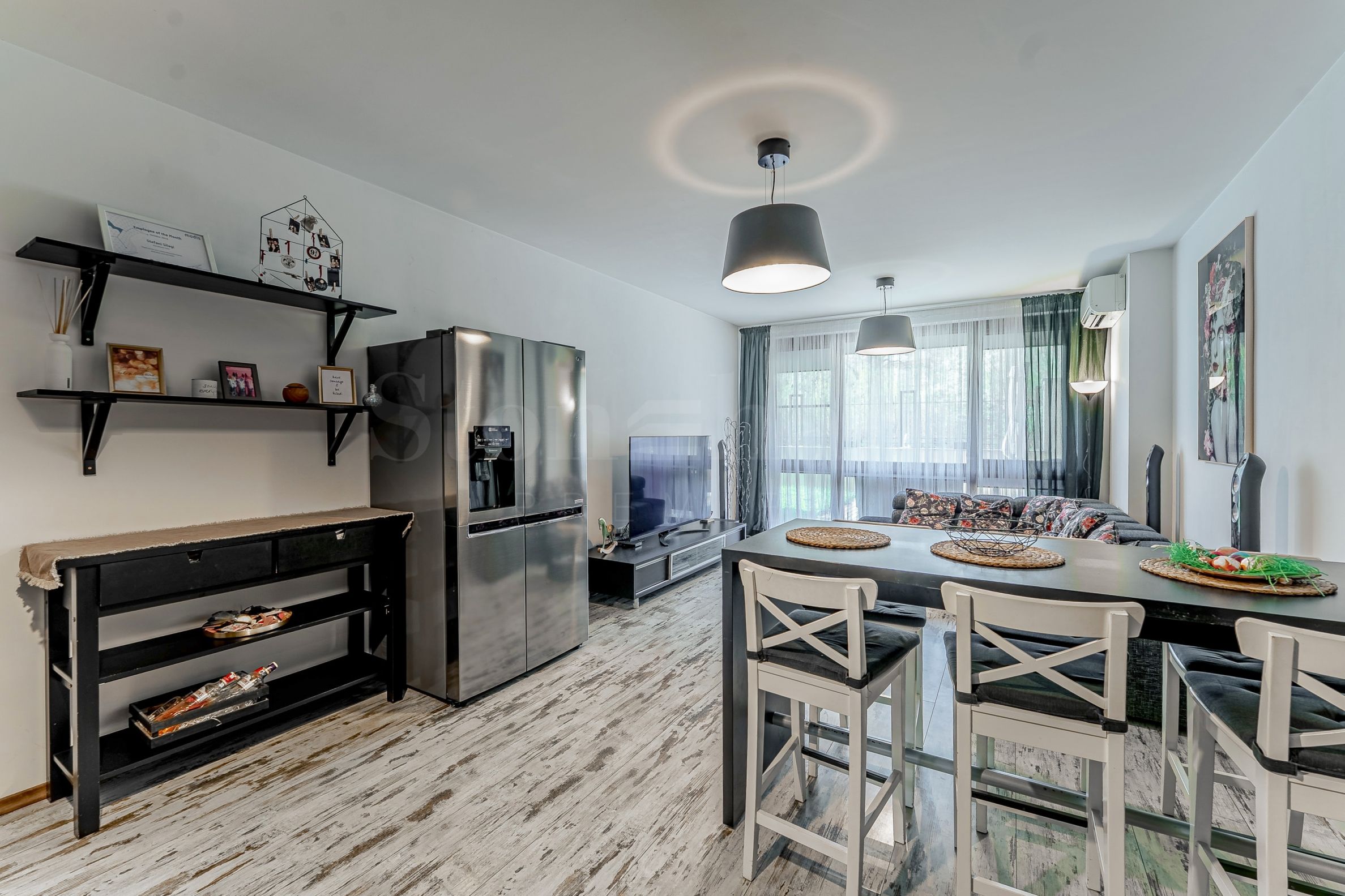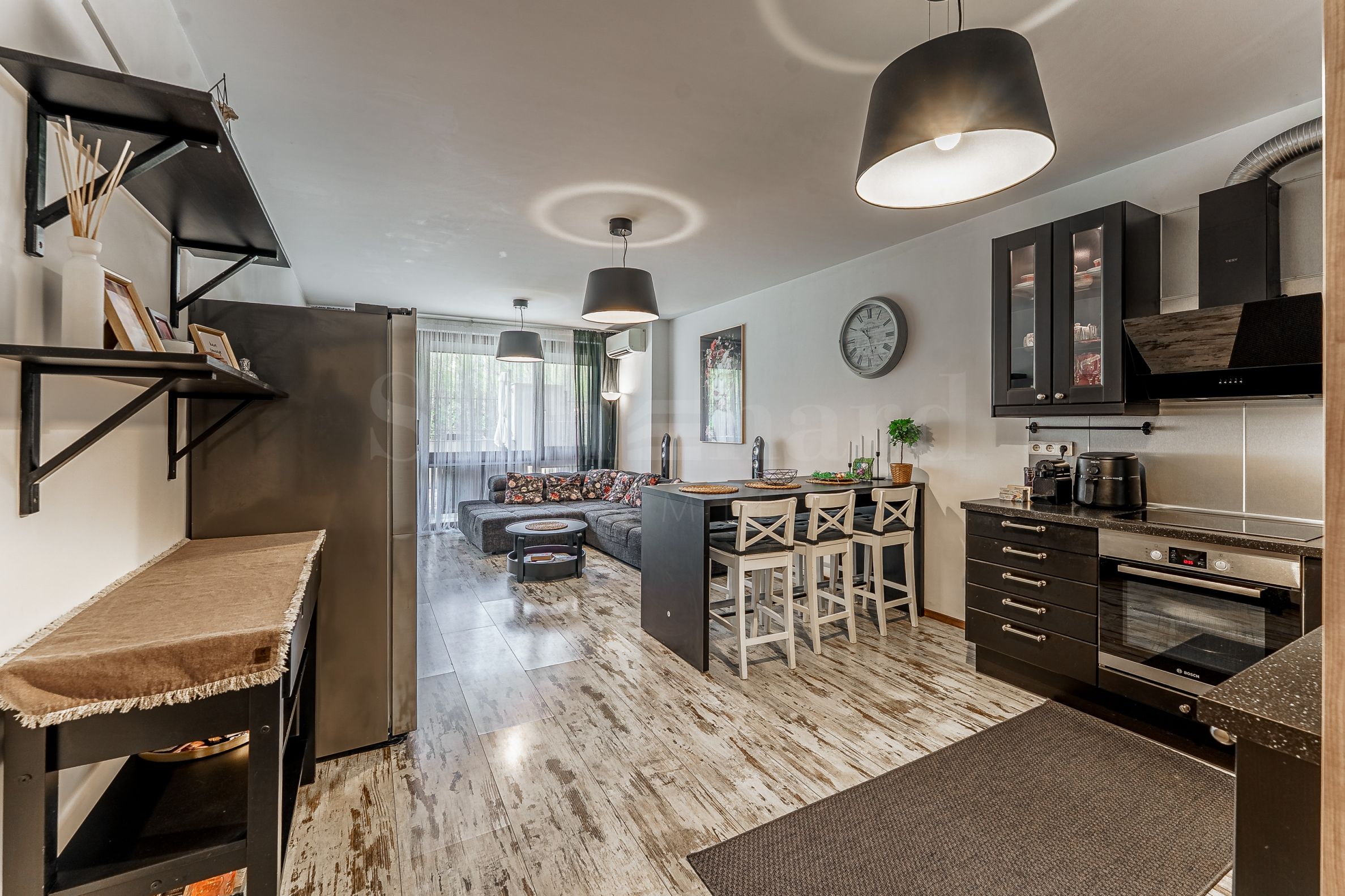 The apartment is offered fully furnished and equipped, ready to move in. The interior is designed in a practical and contemporary style, with an emphasis on convenience and everyday comfort.