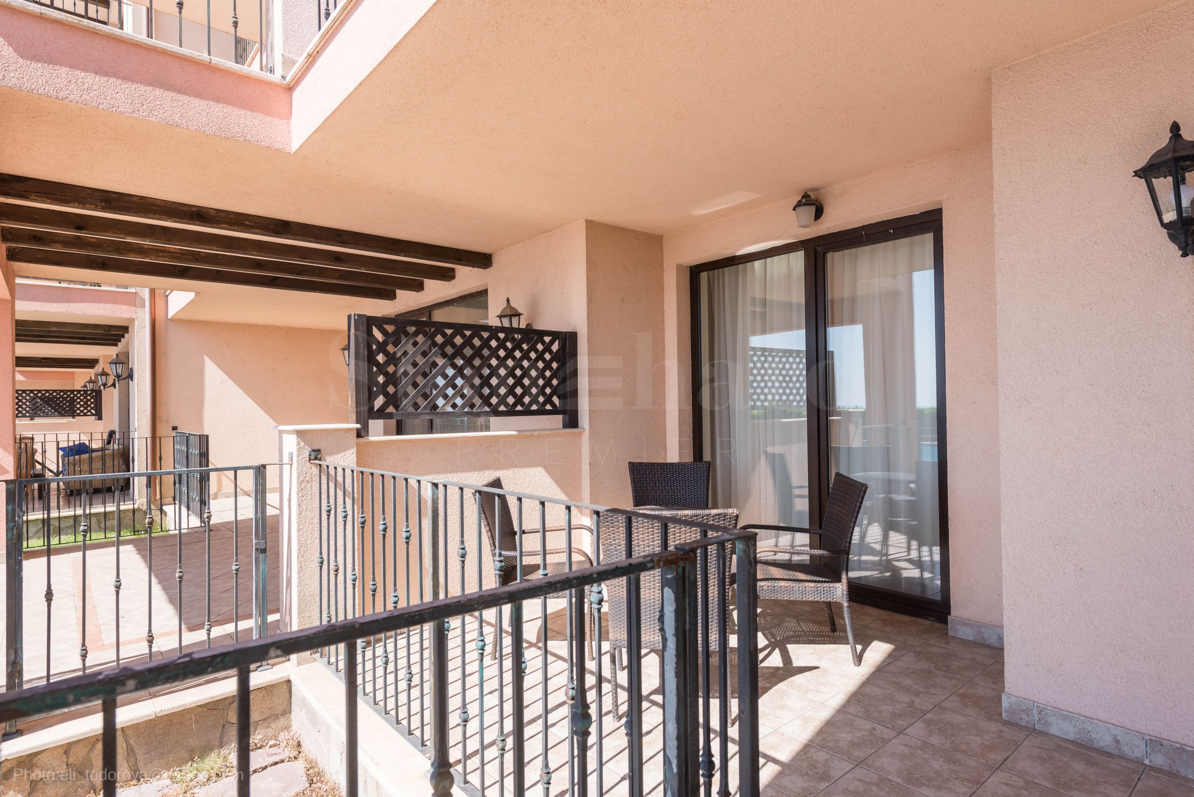 The property has an area of 146.12 m2 and consists of an entrance hall, a living room with a kitchen, two bedrooms, two bathrooms with a toilet (both equipped with bathtubs), a fireplace and a terrace. It is offered for sale fully furnished and with a built-in kitchen, furnished bedrooms, as well as equipped bathrooms. The spacious veranda gives the opportunity to place garden furniture where you can enjoy outdoor evenings. It has access to the two smaller, private pools in the complex, which guarantee you a peaceful holiday. The other option is to take advantage of the main infinity pool where the bar is located.
