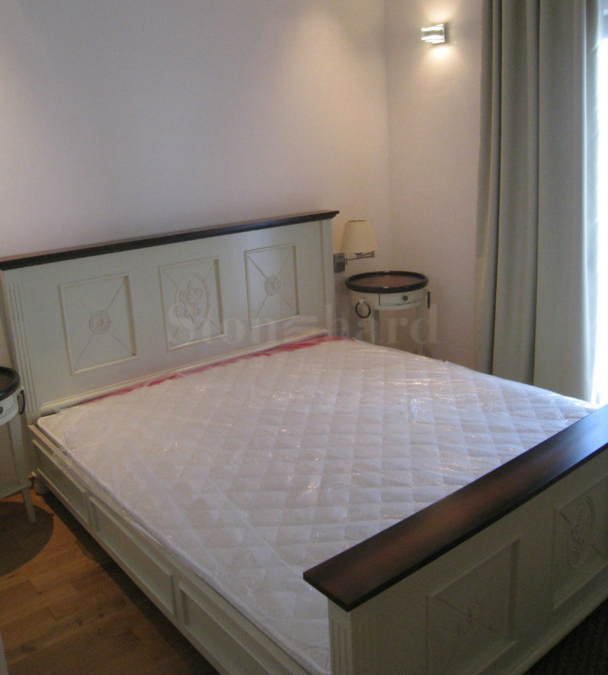 The property’s total built up area is 132.78 sq.m, including 18.74 sq.m of common parts. Entrance hall leads to a large trapezoidal living room, which comprises an open plan kitchen, dining area and lounge. Further, the corridor will take you to a bedroom with en-suite bathroom and a very large balcony, which can be used for al fresco dining. Another door of the corridor opens to a master bedroom featuring en-suite bathroom with a bathtub and its own balcony. There is a separate guests’ WC. The apartment is furnished and equipped with all the necessary home appliances.