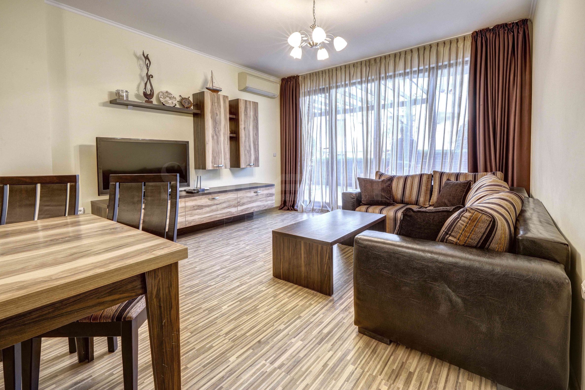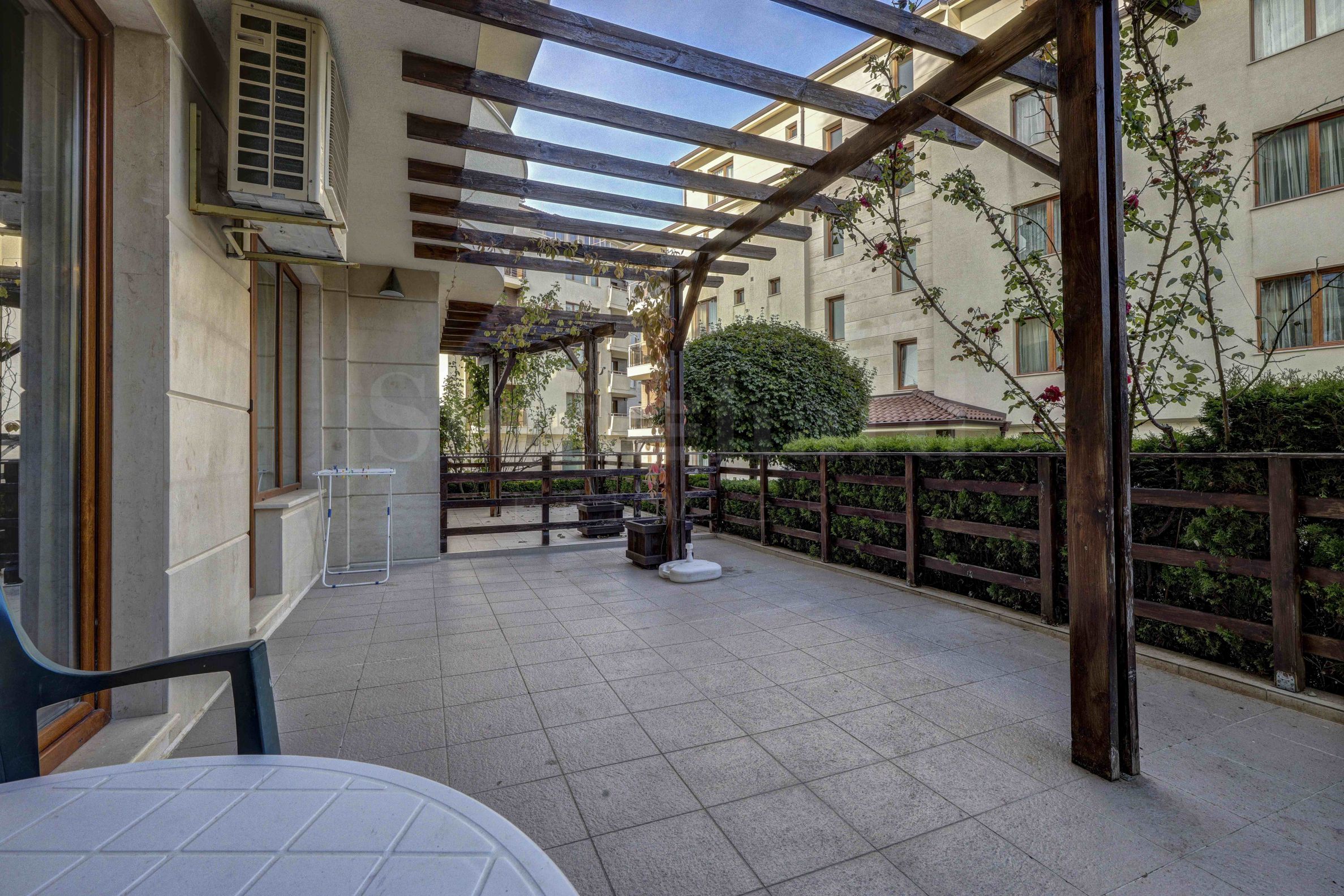 Stylishly furnished, the apartment is located on the first floor, with a southeast exposure and has an area of 104 m2. It has a bright and spacious living room with a kitchen area, and from the living room you have access to a large veranda surrounded by hedges and a decorative wooden fence, where you can enjoy your morning coffee or a family dinner. The bedroom has the same south-east exposure and offers access to the veranda. The apartment offers an equipped bathroom with a large bathtub for better comfort, as well as a closet for additional luggage.