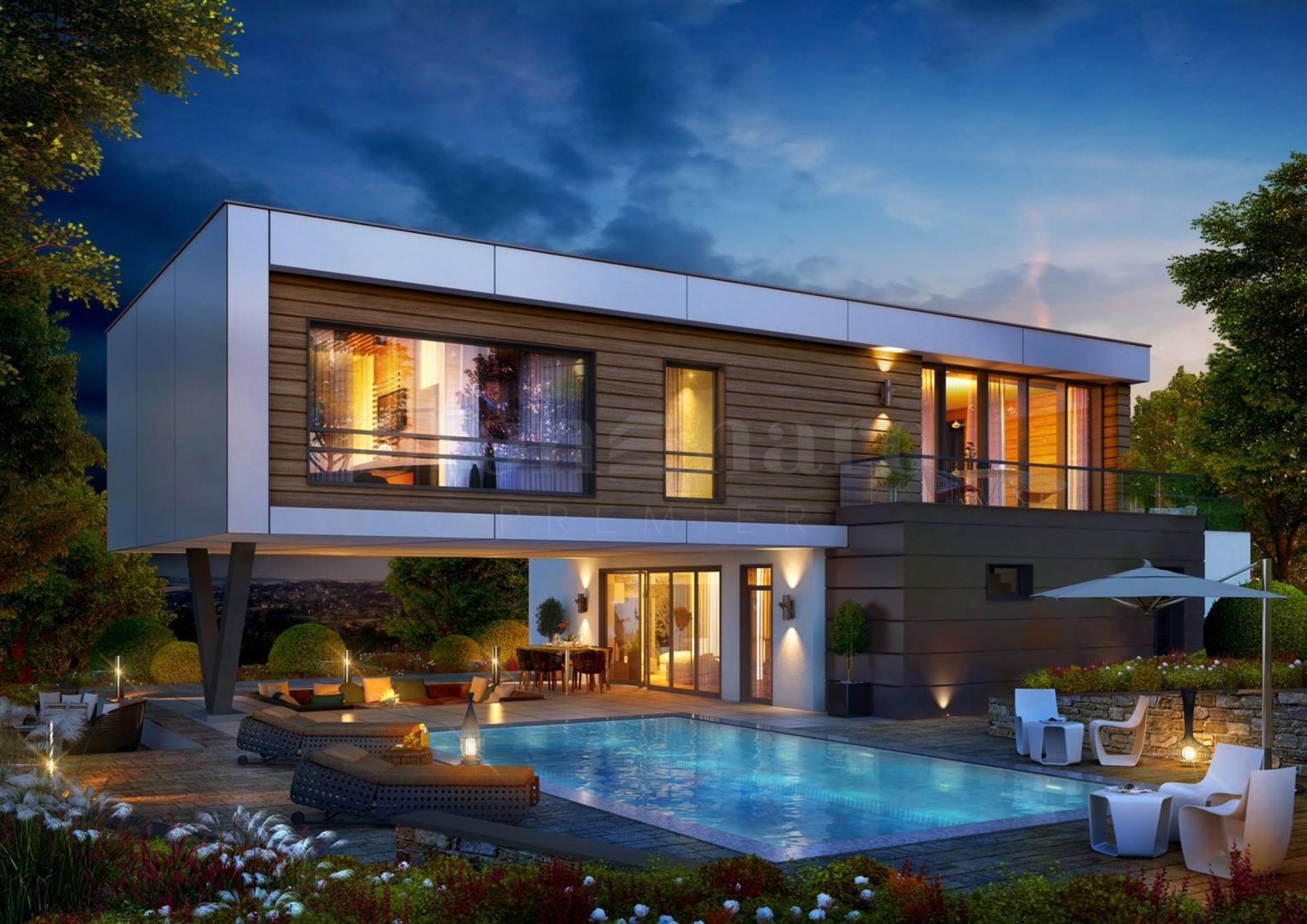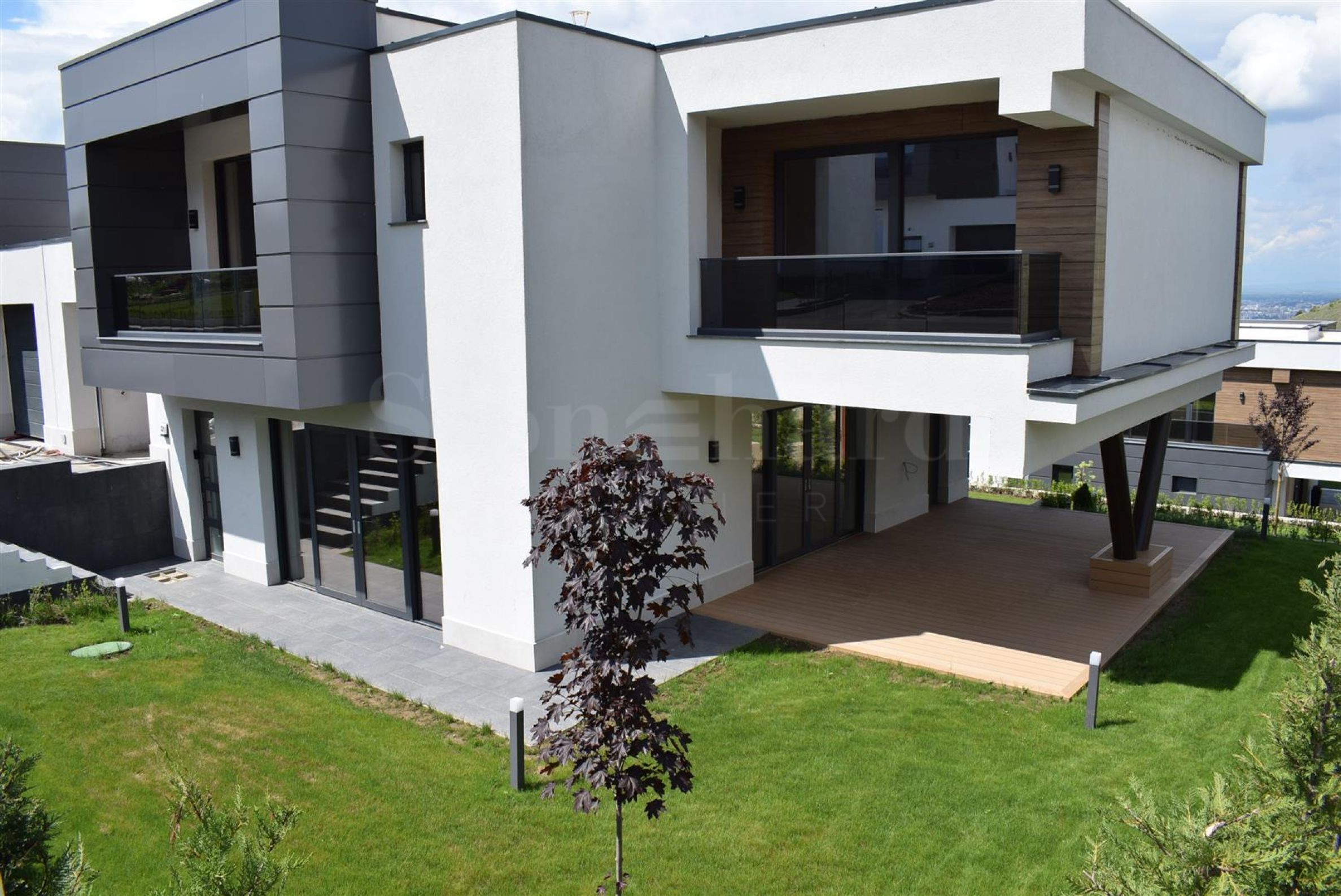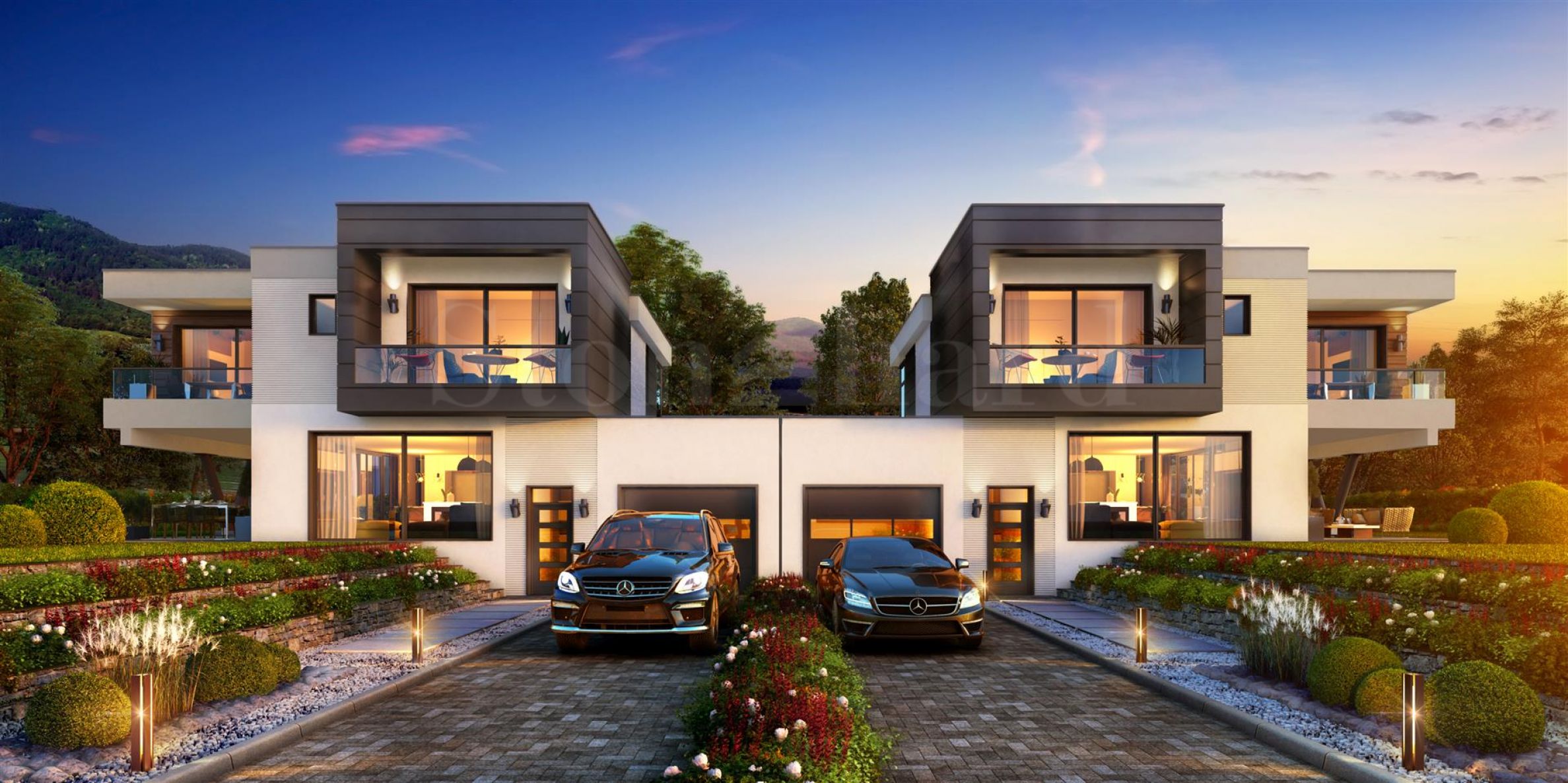 The complex has an administrative part, which includes a coffee bar and restaurant, a kindergarten, a fitness center, a minimarket, a car wash, a football field, a tennis court, a private garage, and 24-hour security. 90 luxury houses will be built, which are separated into 10 neighborhoods on a total area of 100 acres and are divided into four types according to your preferences.