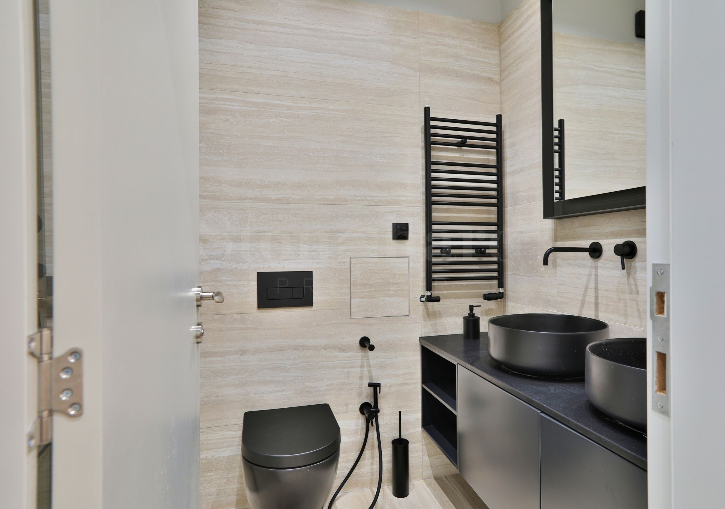 Bathroom – Italian faience – Imperiale, faucets – Travertino, bathroom accessories Bruma, Sonco and Bianchi.