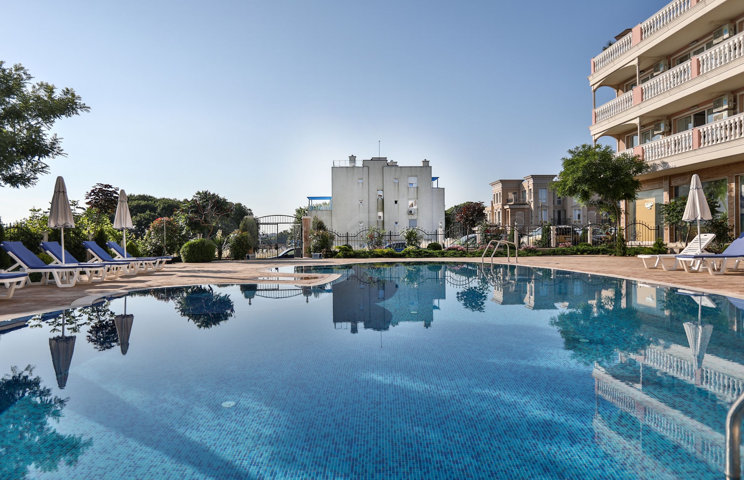 The building stands out for its sophisticated and elegant architecture, with spacious terraces with balustrades. It is oriented towards the sea coast and offers incredible views of the sea and the beach. There are all the necessary amenities for a pleasant vacation on the territory: swimming pool, underground parking and restaurant, security, video surveillance and reception.