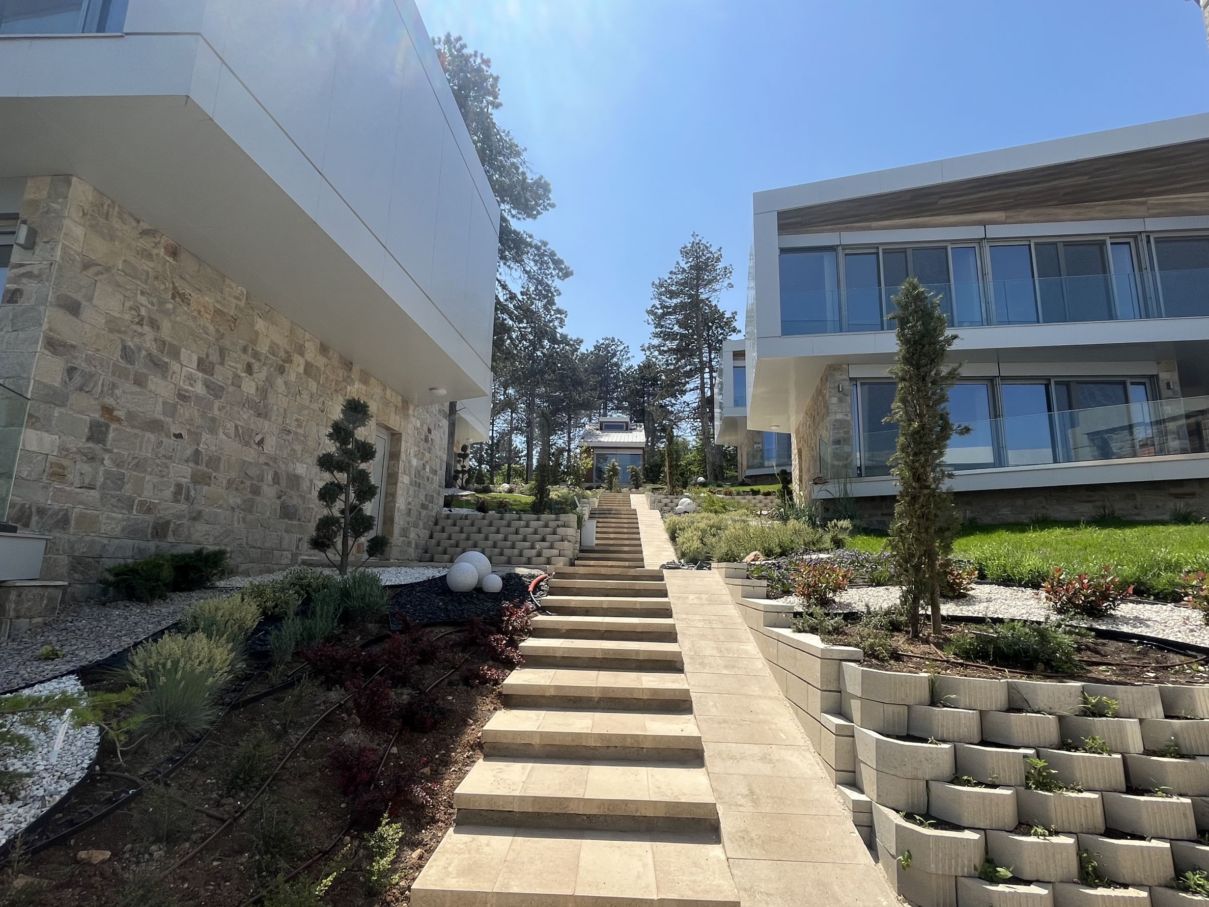 Complexul are gard, iar accesul se va face printr-o barieră automată. Parcarea va fi amplasată în partea inferioară a complexului, iar accesul la case se va face printr-o alee centrală, cu rampe prevăzute pentru o deplasare convenabilă. În partea superioară, unde complexul este liniștit și înconjurat de vegetație de pini, există o zonă de relaxare și facilități pentru copii, jocuri pentru întreaga familie, un grătar și o zonă pentru luat masa și divertisment în aer liber, cu priveliști plăcute asupra mării. Curtea va fi amenajată peisagistică și completată cu un iluminat spectaculos.