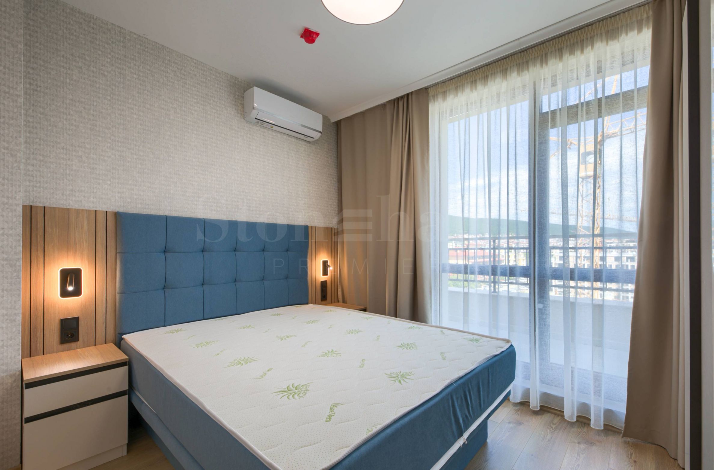 Dormitor - parchet laminat, pereți și tavane - tencuite și vopsite cu latex, tapet decorativ, întrerupătoare, prize și prize montate, aer condiționat individual, dimensiune dormitor 160/200, 2 noptiere, masă de toaletă cu comodă, oglindă, taburet, dulap, corpuri de iluminat, perdele subțiri și perdele groase;