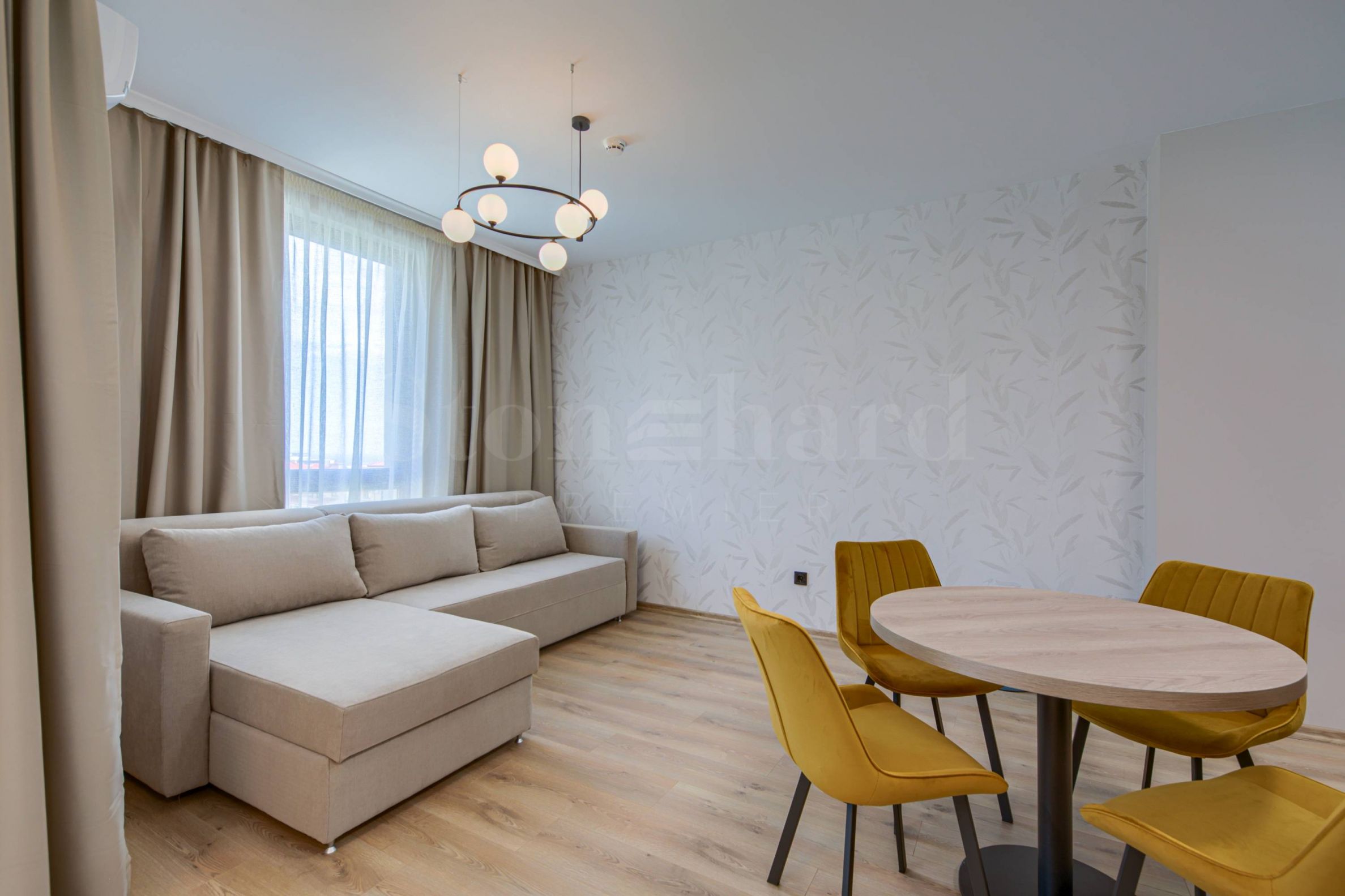 Dormitor - parchet laminat, pereți și tavane - tencuite și vopsite cu latex, tapet decorativ, întrerupătoare, prize și prize montate, aer condiționat individual, dimensiune dormitor 160/200, 2 noptiere, masă de toaletă cu comodă, oglindă, taburet, dulap, corpuri de iluminat, perdele subțiri și perdele groase;