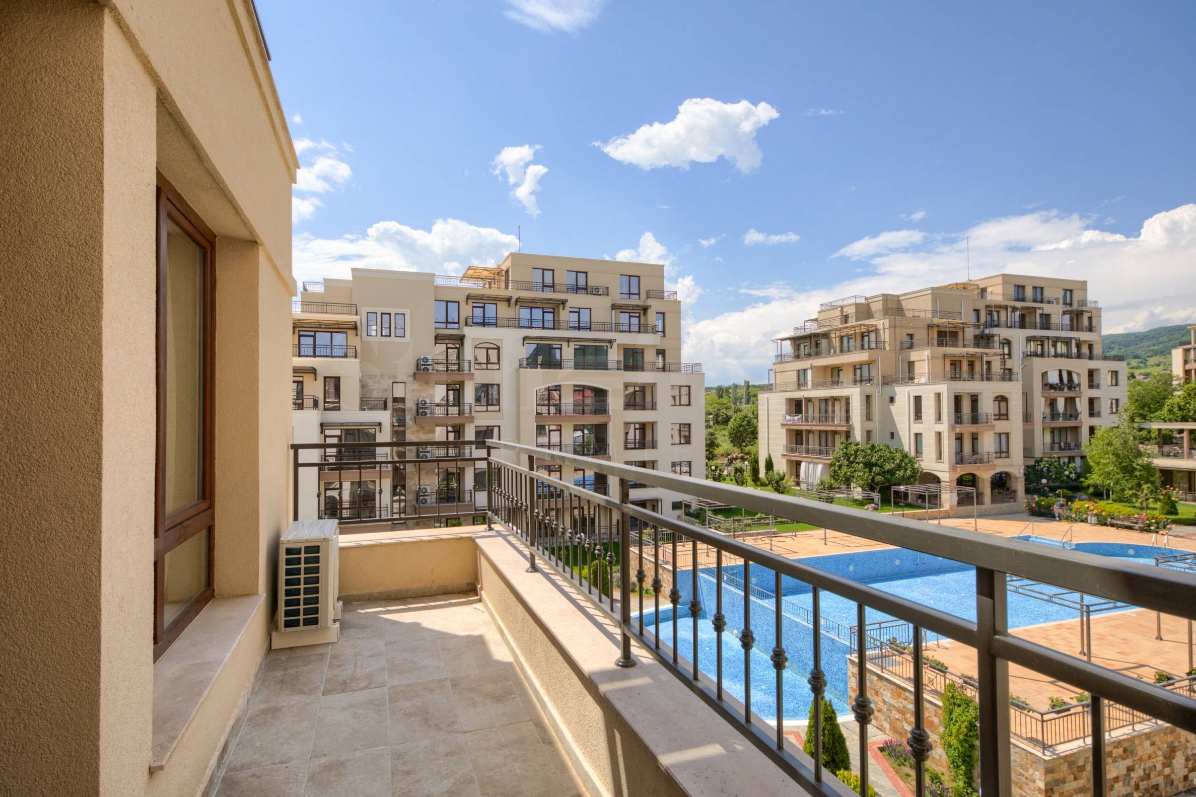 Complexul confortabil este format din două clădiri cu 6 etaje situate una față în față și două clădiri cu un singur etaj poziționate de o parte și de alta a intrării principale. Două clădiri noi cu câte 6 etaje sunt în construcție, care vor fi paralele cu celelalte și împreună vor forma un cerc complet în jurul piscinei și grădinii complexului. Complexul dispune de o piscină cu secțiune pentru copii și o a doua piscină separată pentru copii, un loc de joacă și o recepție. Există un restaurant excelent și există locuri de parcare lângă clădire. Zona dispune de un supermarket mare, un centru SPA și de fitness, restaurante și alte facilități.