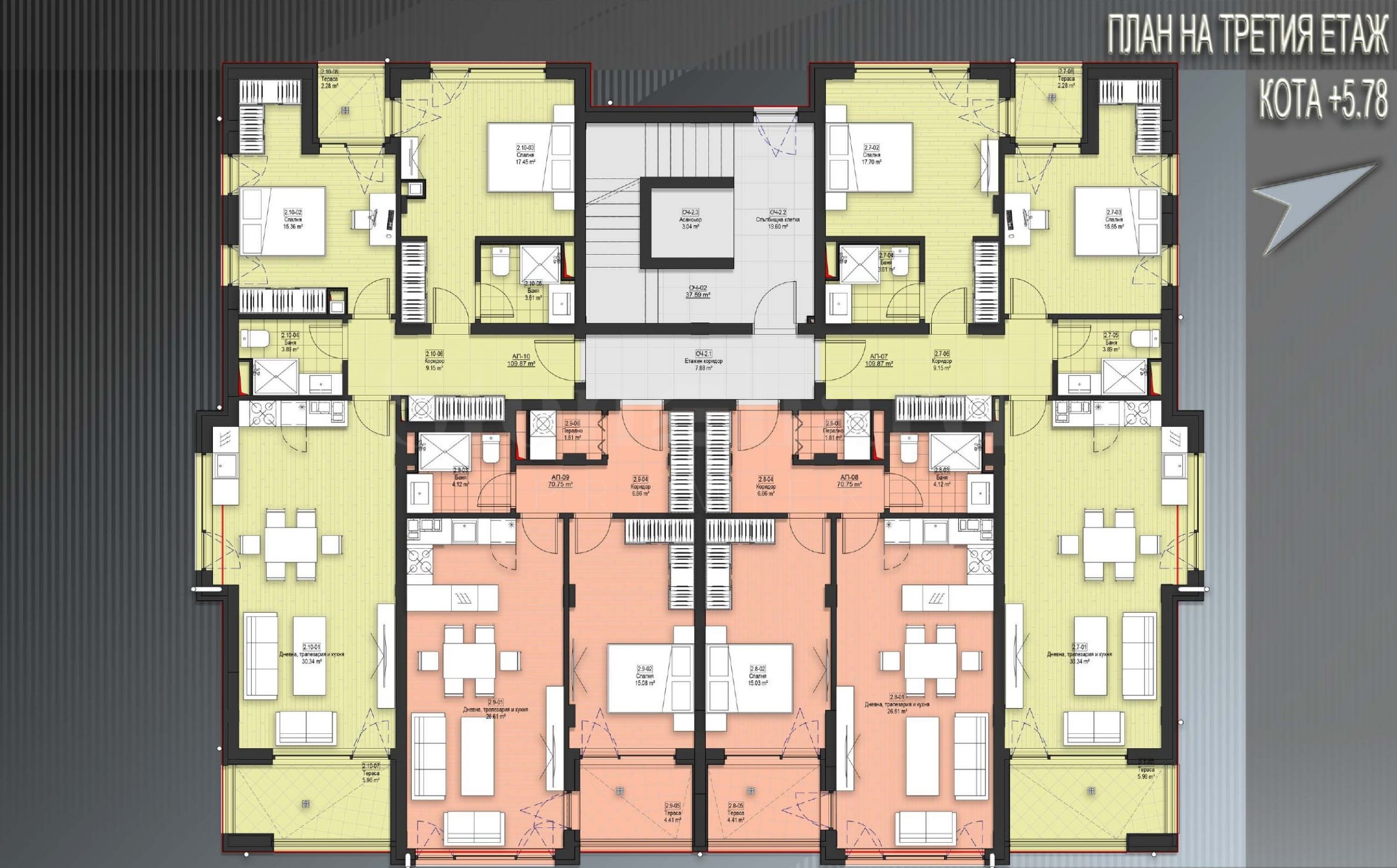 Proprietatea este situată la etajul al treilea și constă dintr-un living spațios cu terasă spre est și fereastră spre nord (30 mp), două dormitoare cu orientare nord-vest (15 mp și 18 mp), unul dintre dormitoare având baie proprie, terasă accesibilă din ambele dormitoare, și o a doua baie.