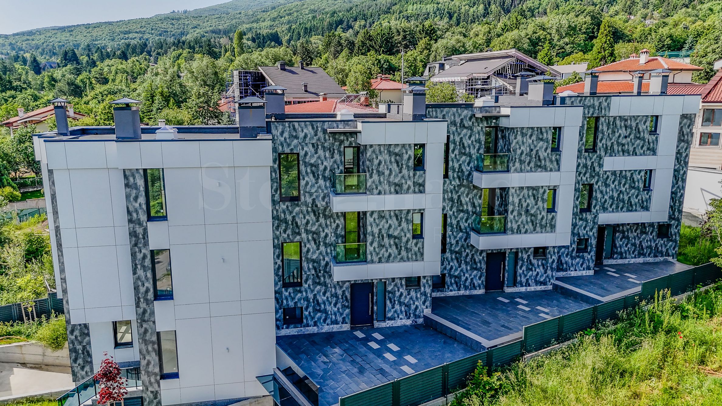 Complexul este organizat în patru clădiri proiectate ca un ansamblu terasat, cu o viziune arhitecturală modernă și materiale și tehnici de înaltă clasă utilizate în construcție. Fiecare casă este formată din trei niveluri supraterane și un subsol, cu garaj dublu cu ușă individuală de garaj și spațiu de depozitare. Casele au camere funcționale și spațioase, cu ferestre franceze care oferă multă lumină naturală și vedere la Munții Vitosha, au și verandă, iar accesul este controlat pentru a asigura confortul și securitatea.