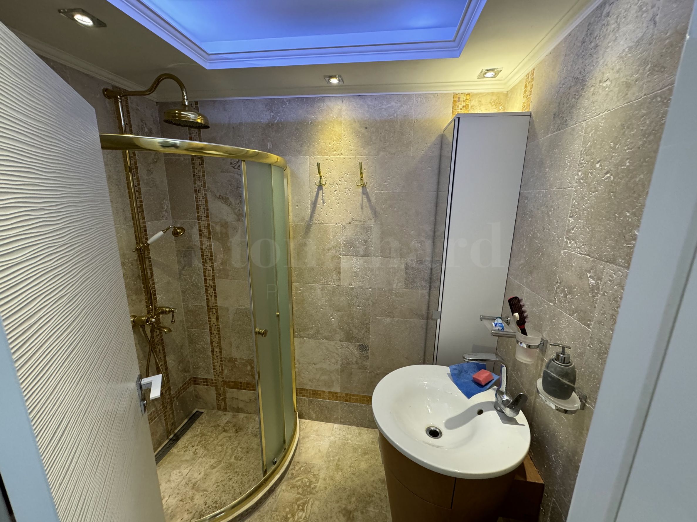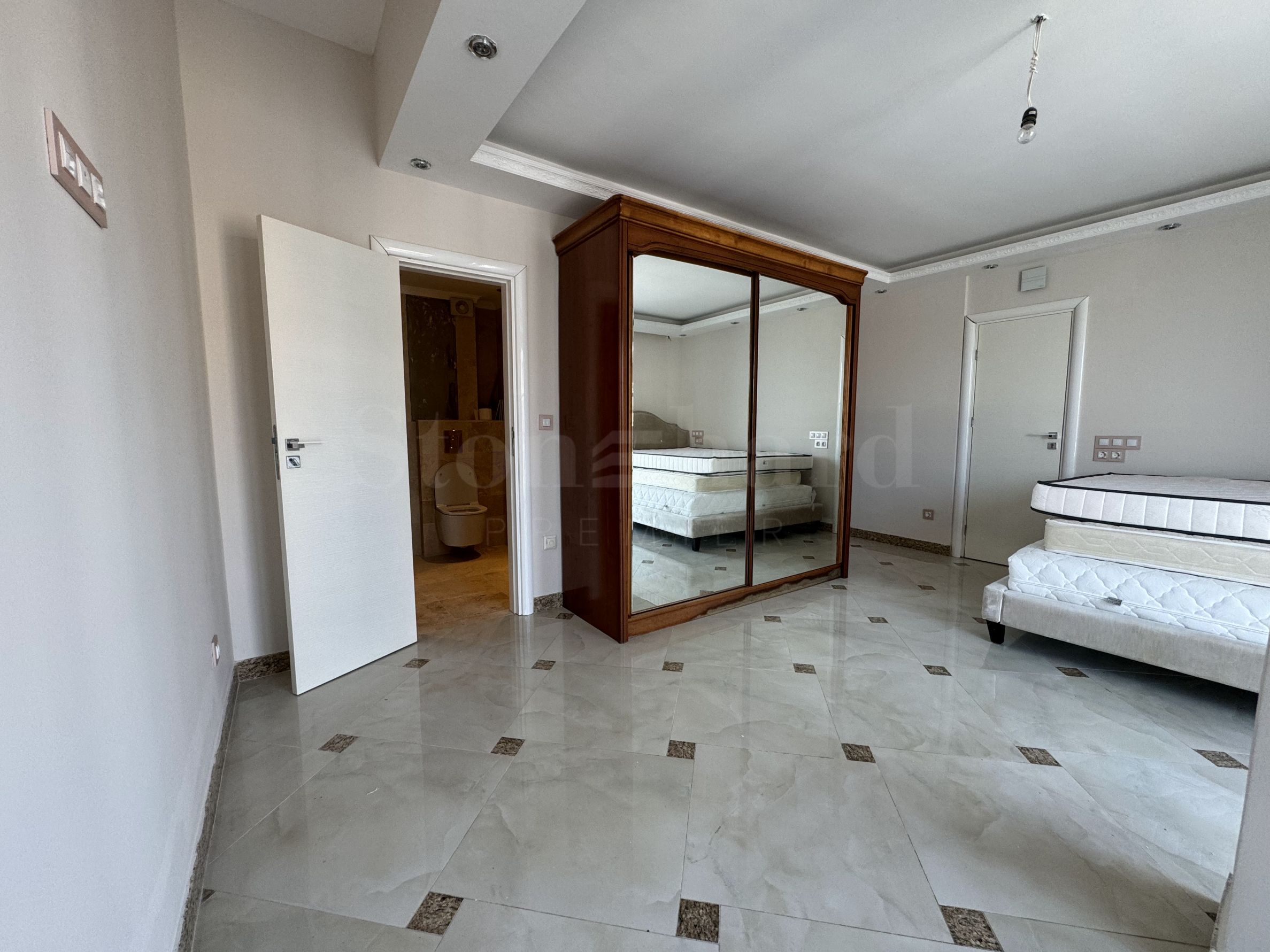 terasă mare închisă cu geamuri, care înconjoară întregul apartament pe perimetru. Mobilier Locuința este finisată calitativ cu lucrări de lux. Pereții și podelele sunt parțial din marmură, iar placarea și podelele din băi sunt din piatră, ceea ce conferă un finisaj elegant.