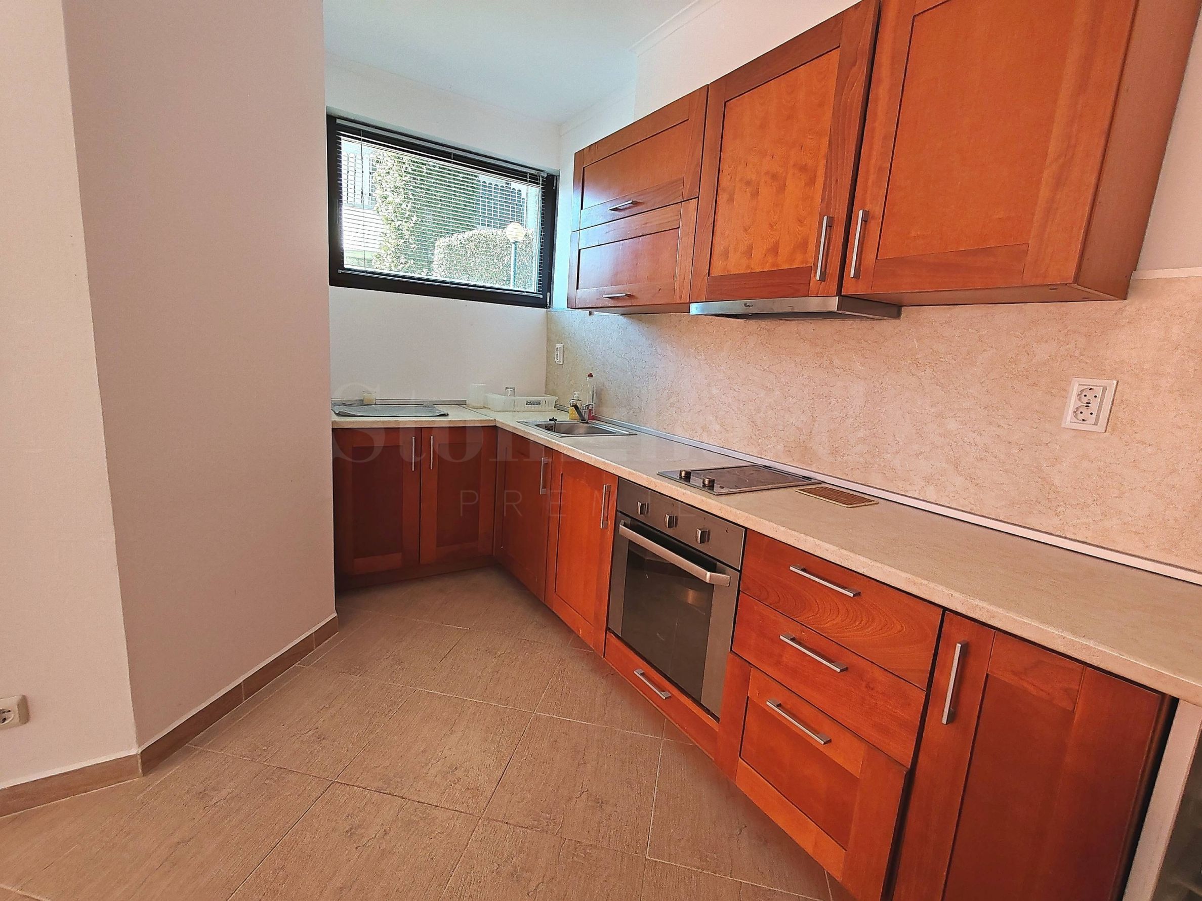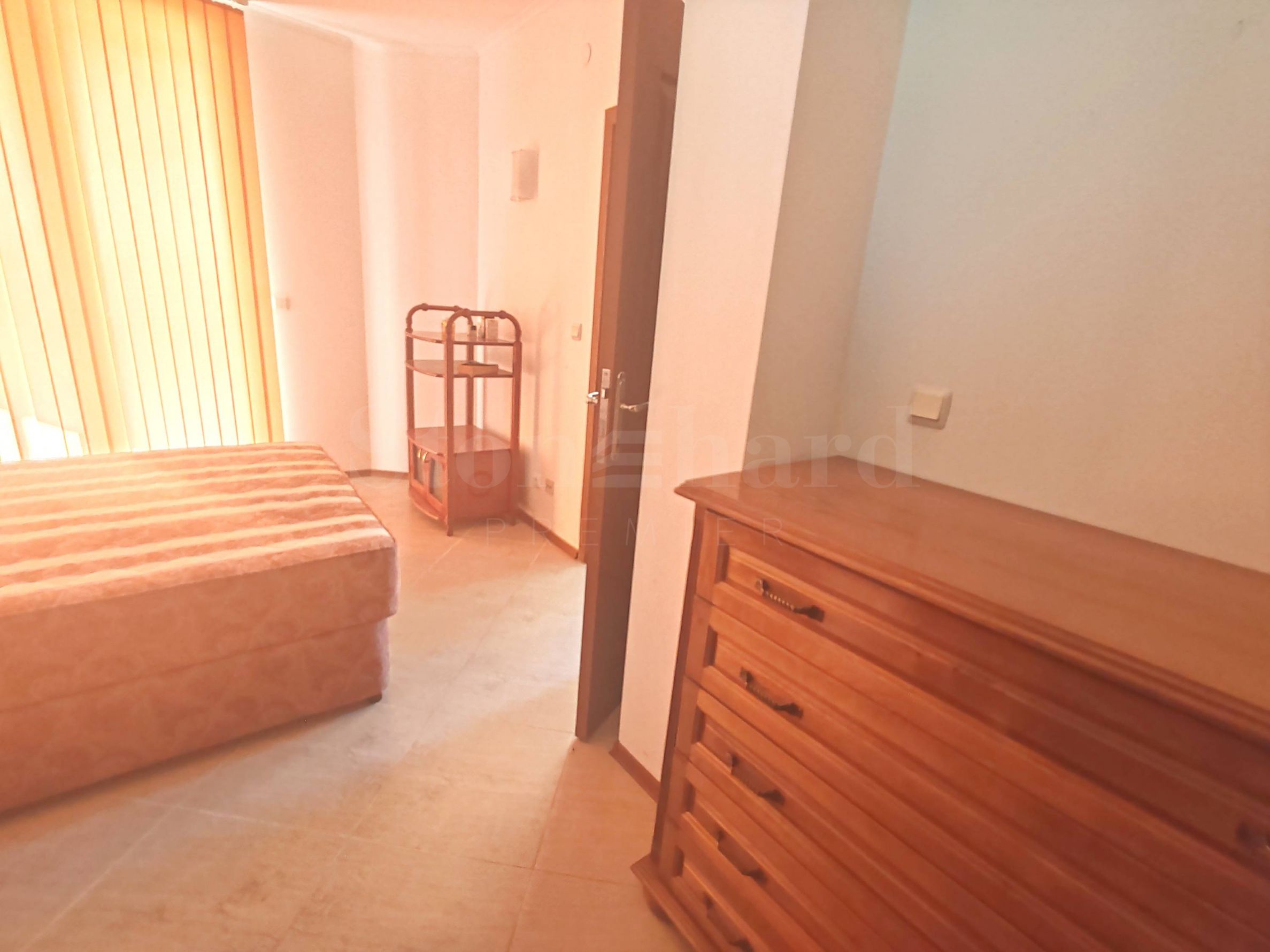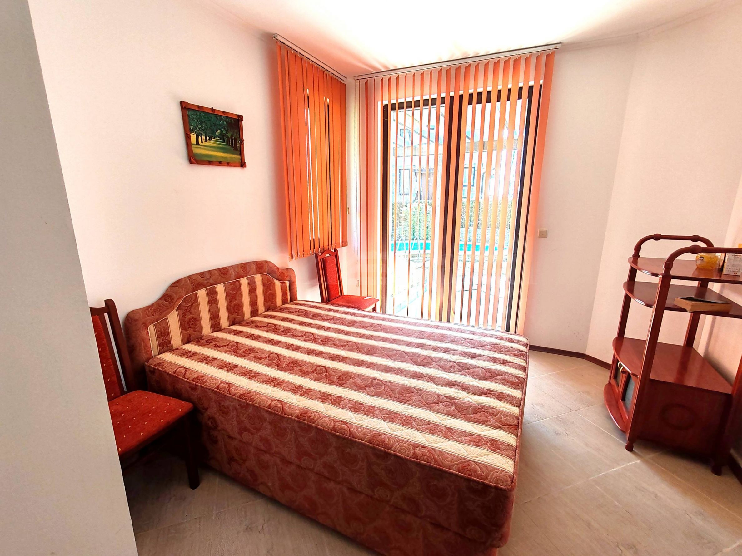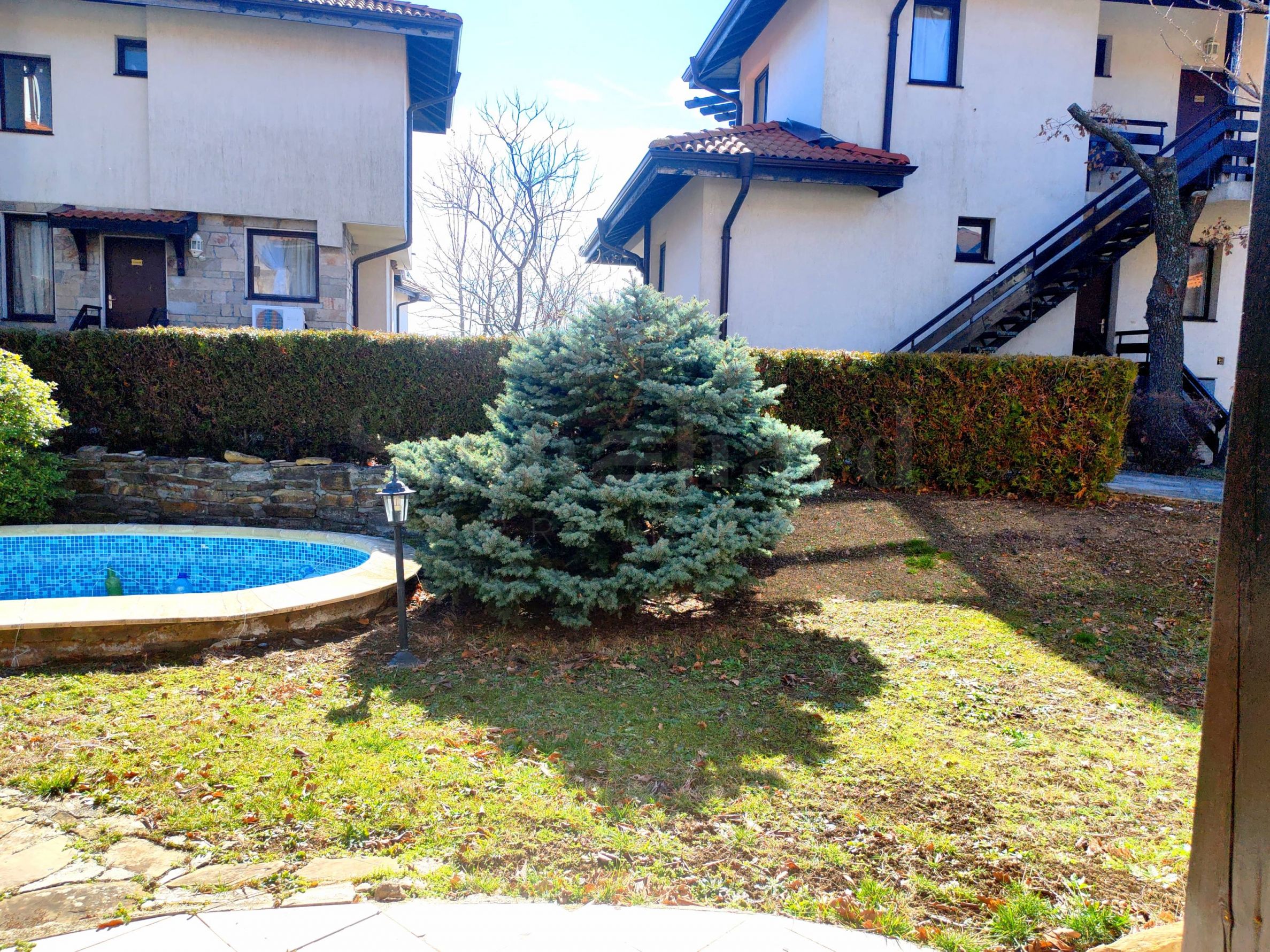 verandă.Apartamentul este mobilat, se vinde cu mobilierul și aparatele existente, este gata pentru mutare sau pentru închiriere. Locuința are acces la o piscină privată, o grădină mare cu pomi fructiferi și multe flori.