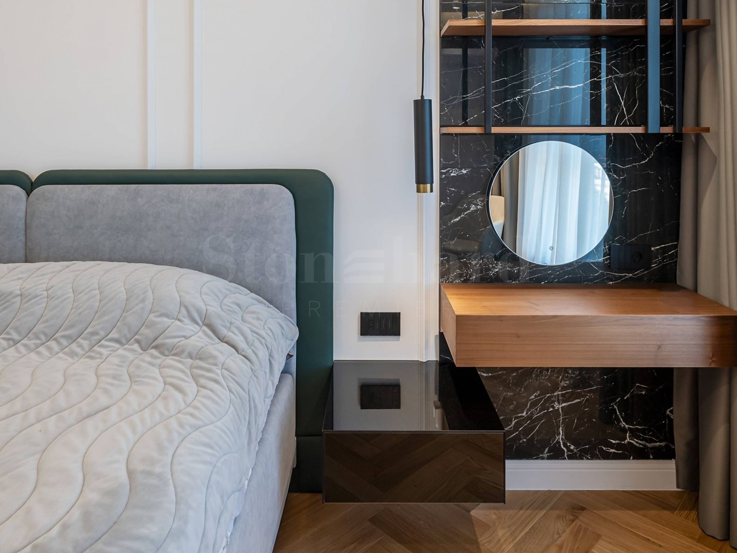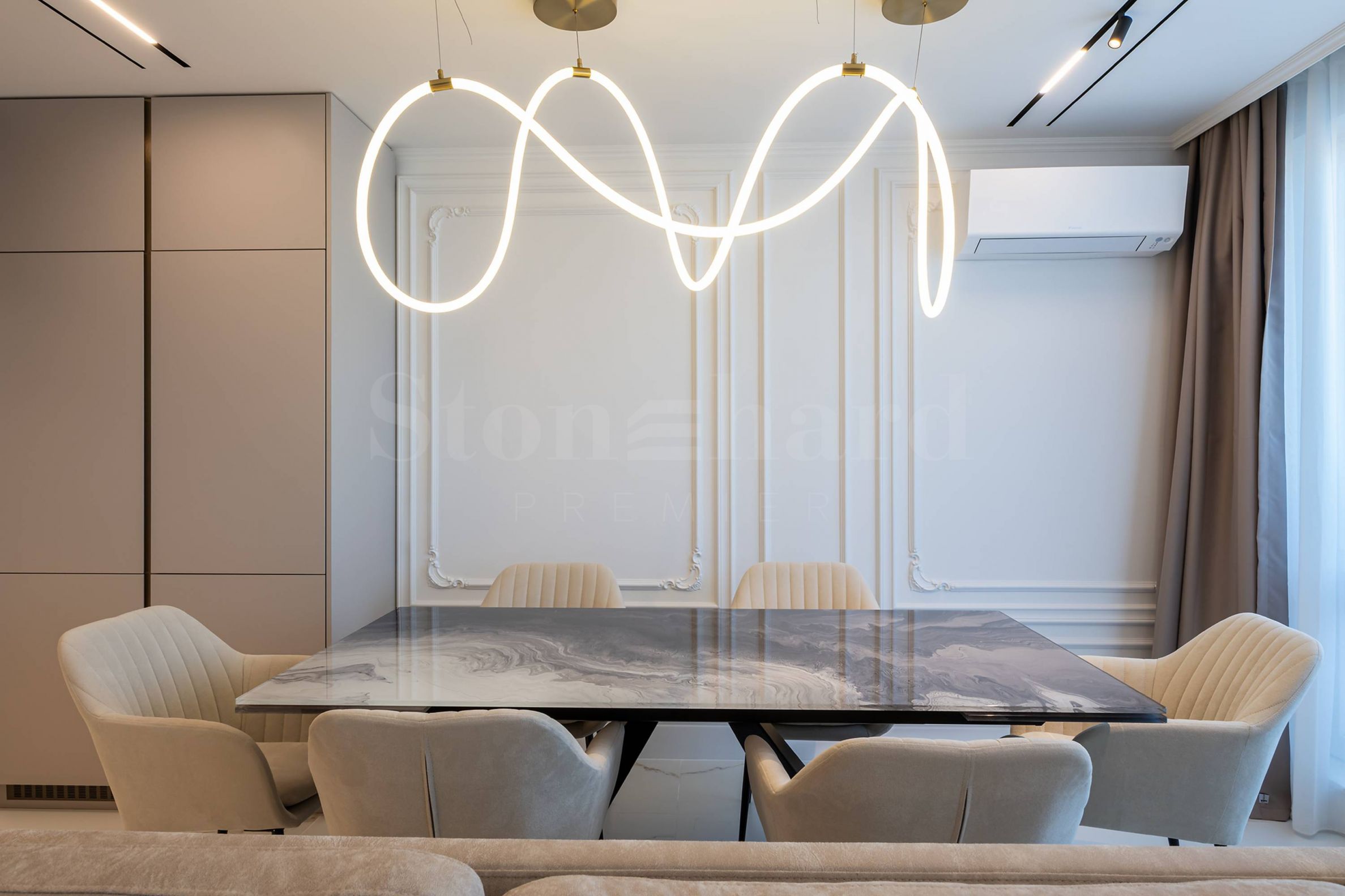 trei terase.Locuința este complet mobilată și echipată cu mobilier și electrocasnice de înaltă clasă, proiectată și realizată cu atenție la cel mai mic detaliu, combinând stilul neoclasic cu soluții moderne de design.