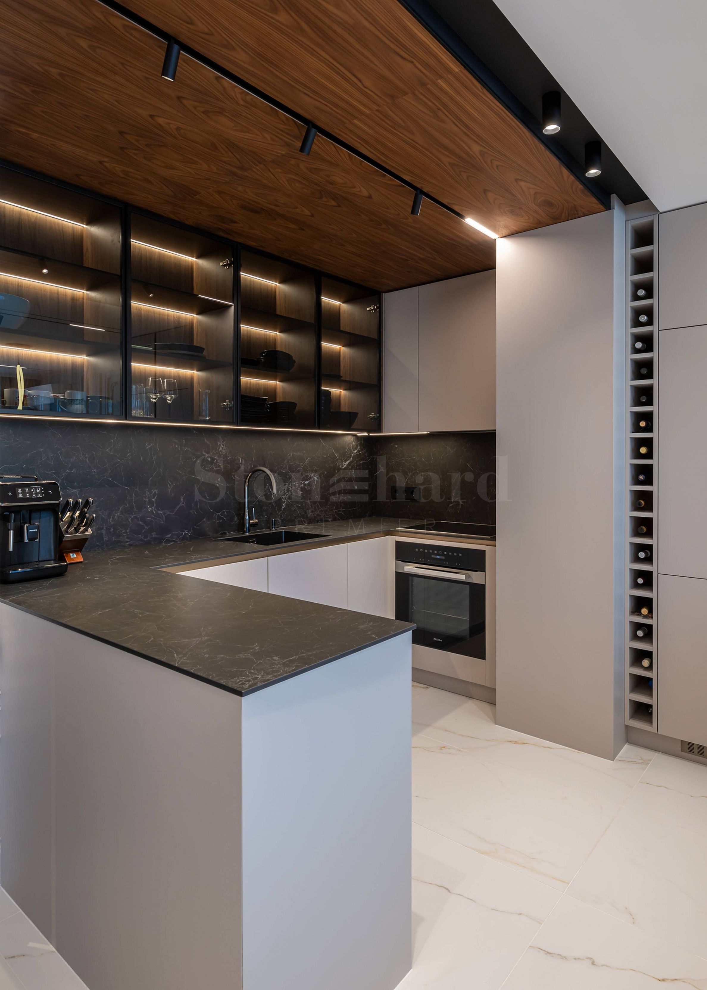 colț de bucătărie cu blat din piatră, două frigidere încorporate Liebherr și aparate marca Miele, spațiu pentru vin;