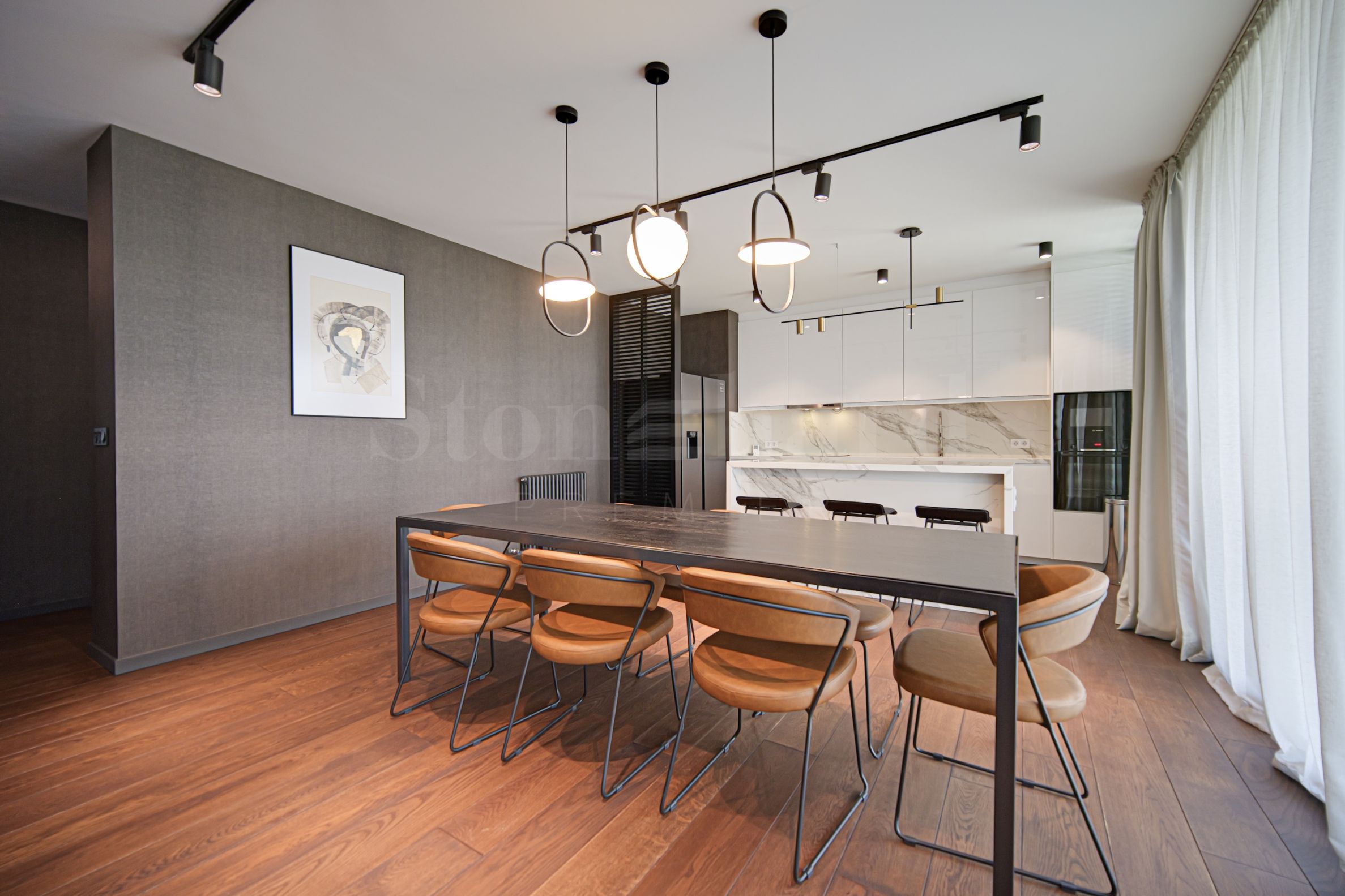 Apartamentul este spațios, luminos și cu tavane înalte, situat la etajul 5 din total 12, cu o suprafață de 165 mp. Finalizat conform unui proiect de design, această proprietate oferă un interior elegant cu atenție la cel mai mic detaliu, mobilă și tehnică de cea mai înaltă clasă.