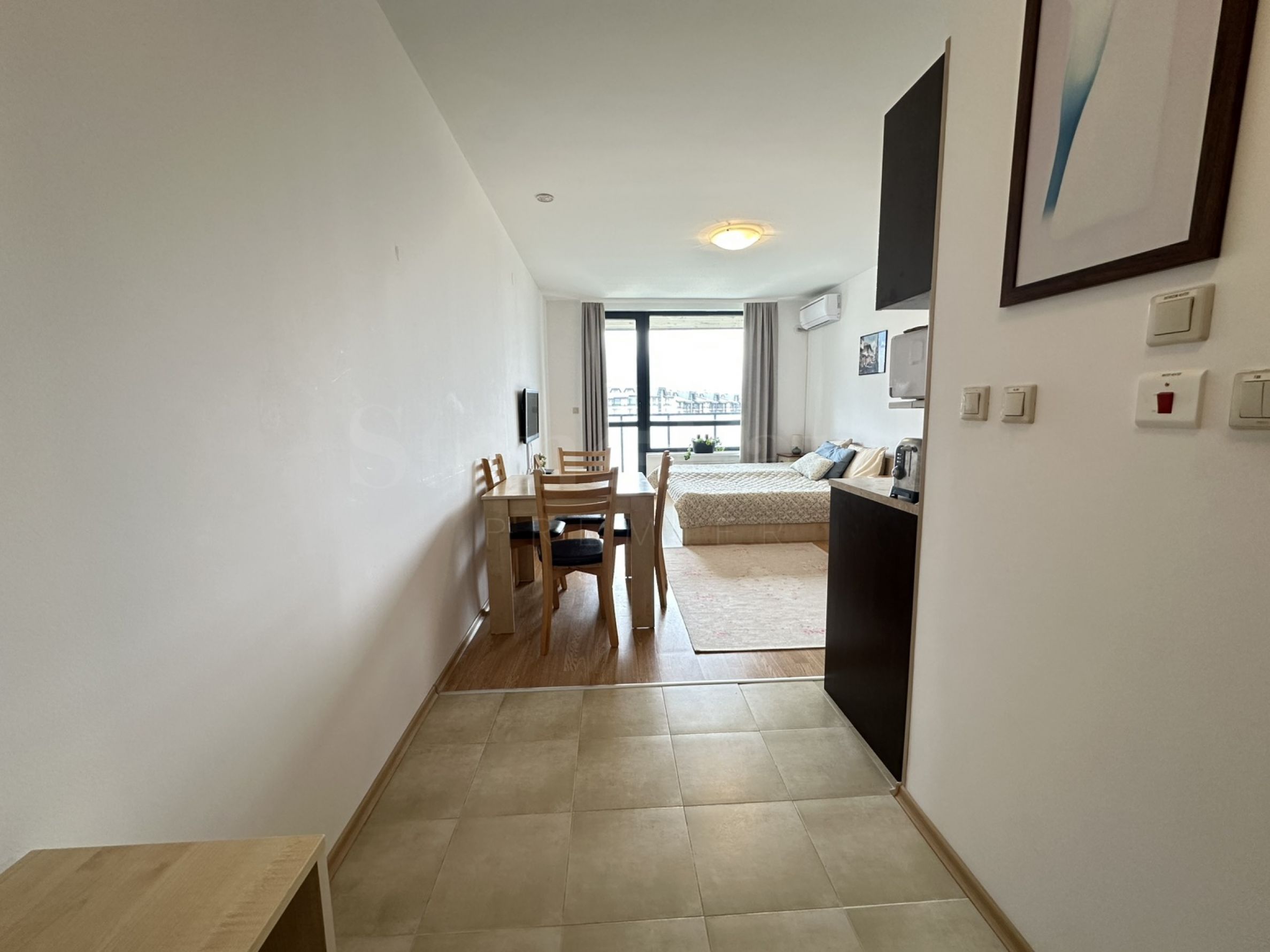 Proprietatea este compusă din: hol, zonă de zi cu dormitor, fotoliu, masă de dining, bucătărie deschisă, balcon și baie cu cadă și toaletă.