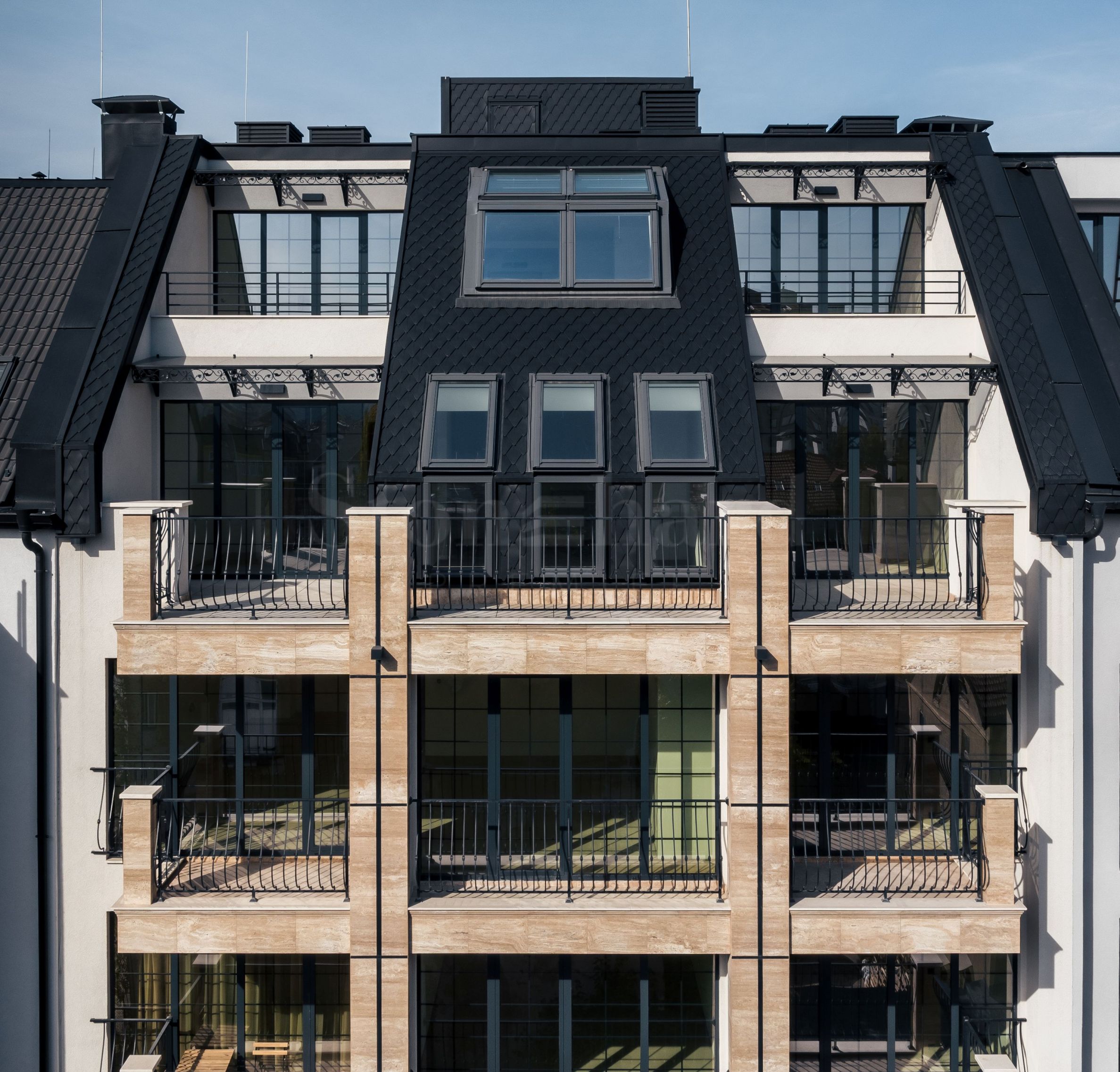 fațade din piatră naturală travertin și balustrade din fier forjat;