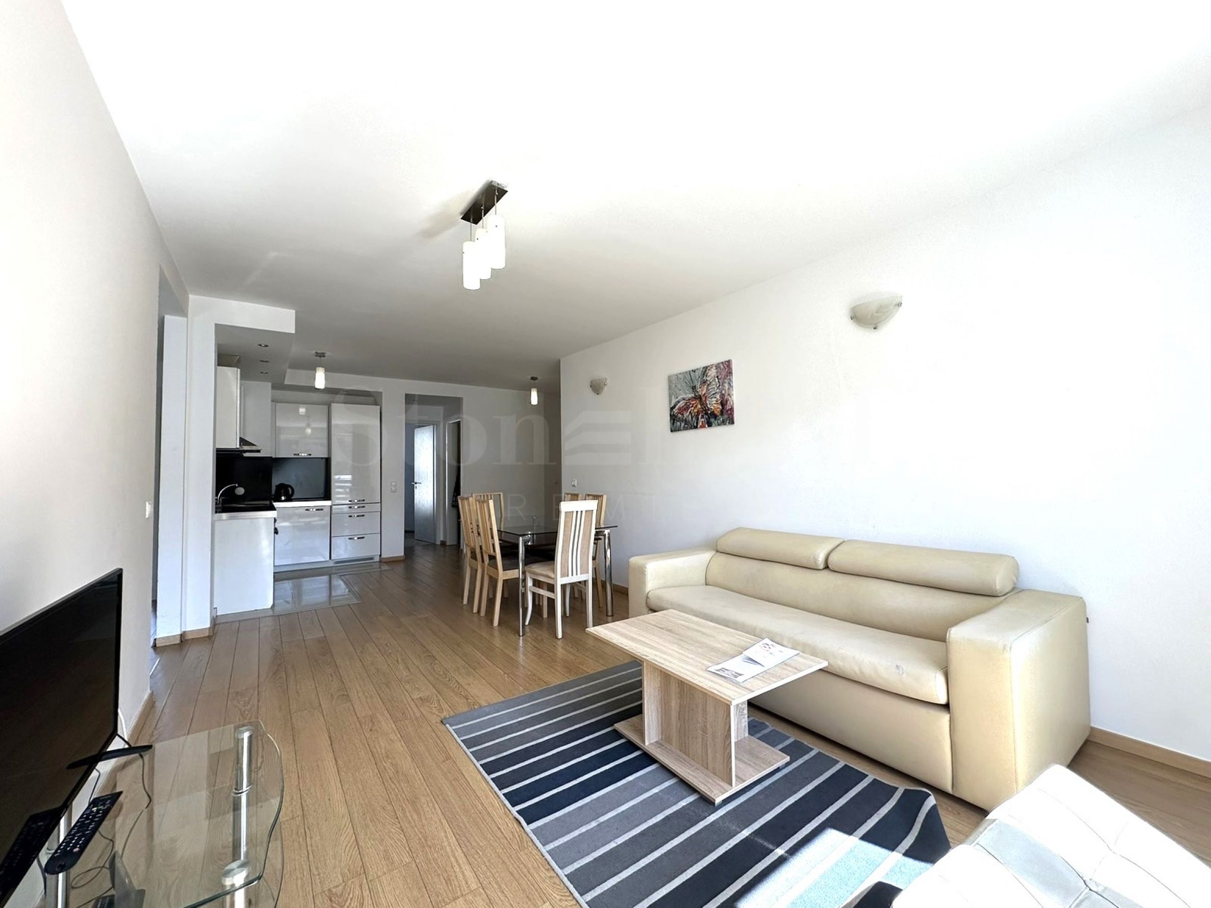 Locuința are un design individual, cu mare atenție la detalii. În decor au fost folosite doar materiale de cea mai înaltă calitate și naturale. Livingul spațios dispune de mobilier moale și o bucătărie albă, complet echipată cu aparatură de înaltă clasă: cuptor, plite și frigider.