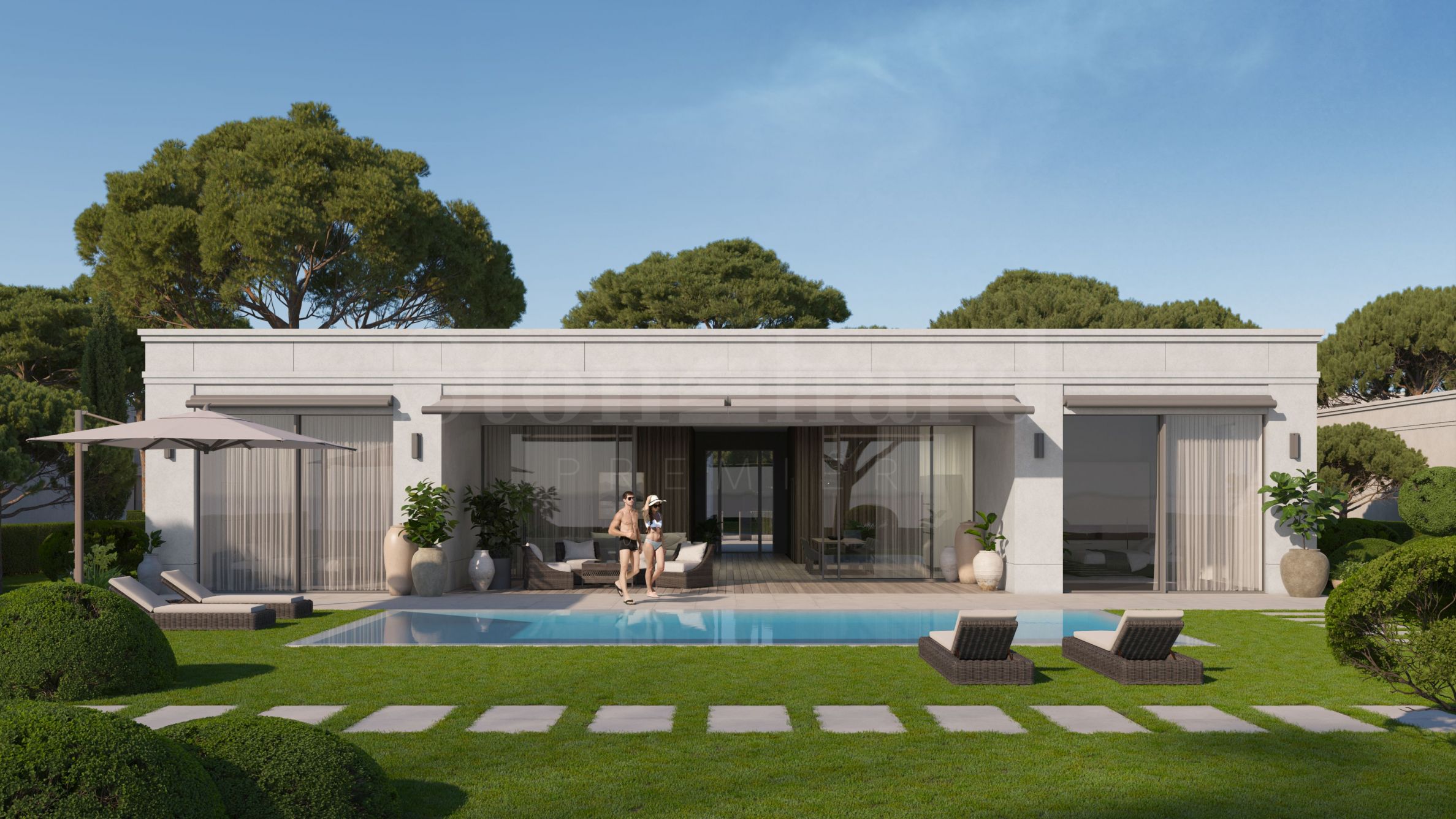 • pe prima linie - 9 vile parter, fiecare cu curte proprie și opțiune pentru piscină, cu 3 locuri de parcare în aer liber;