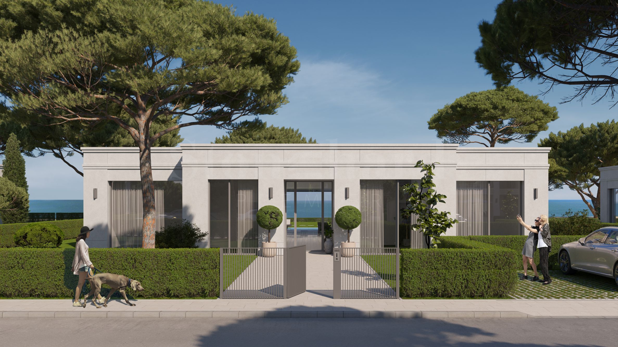 pe prima linie - 9 vile cu un singur etaj, fiecare cu curte și piscină proprie și 3 locuri de parcare exterioare;