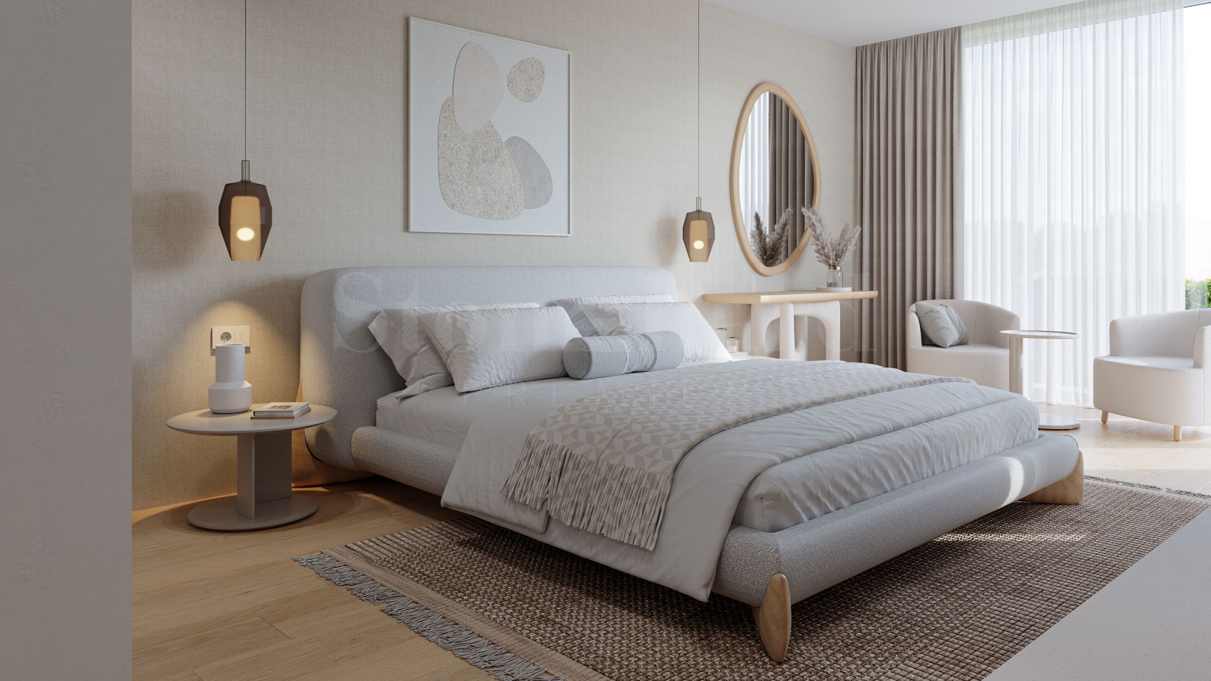 Pe a treia linie de plajă, sunt planificate 4 clădiri de 3 etaje + terasate, cu apartamente spațioase cu trei și patru dormitoare, la doar 100 de metri în linie dreaptă de mare. Apartamentele de aici vor fi oferite complet mobilate.