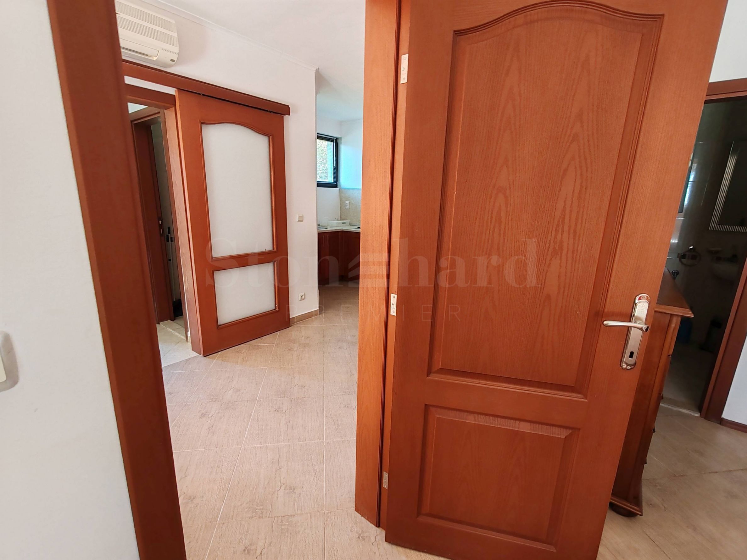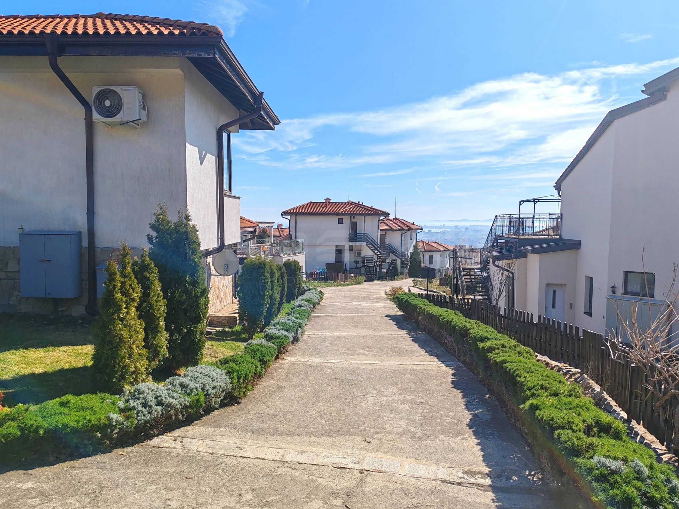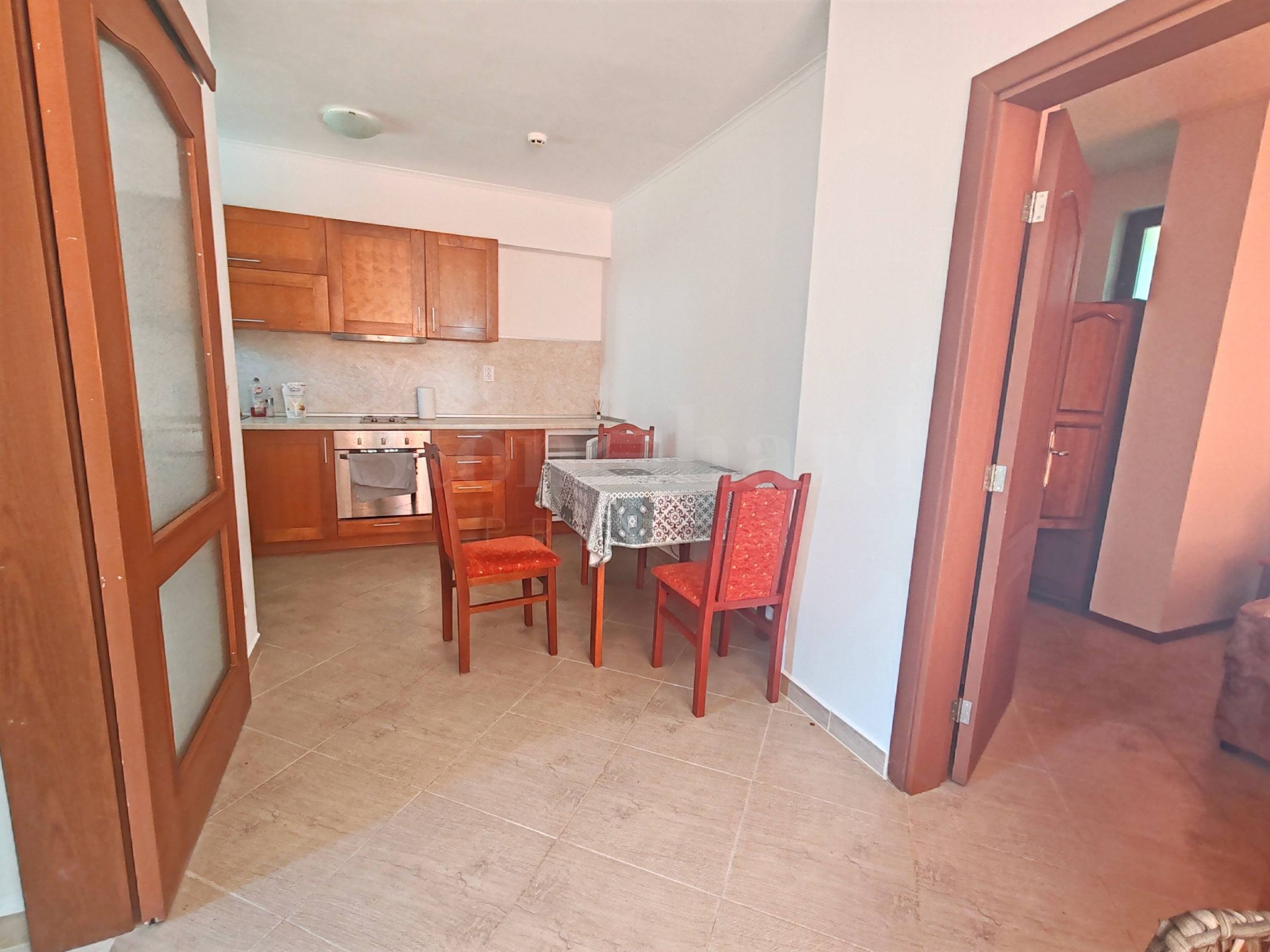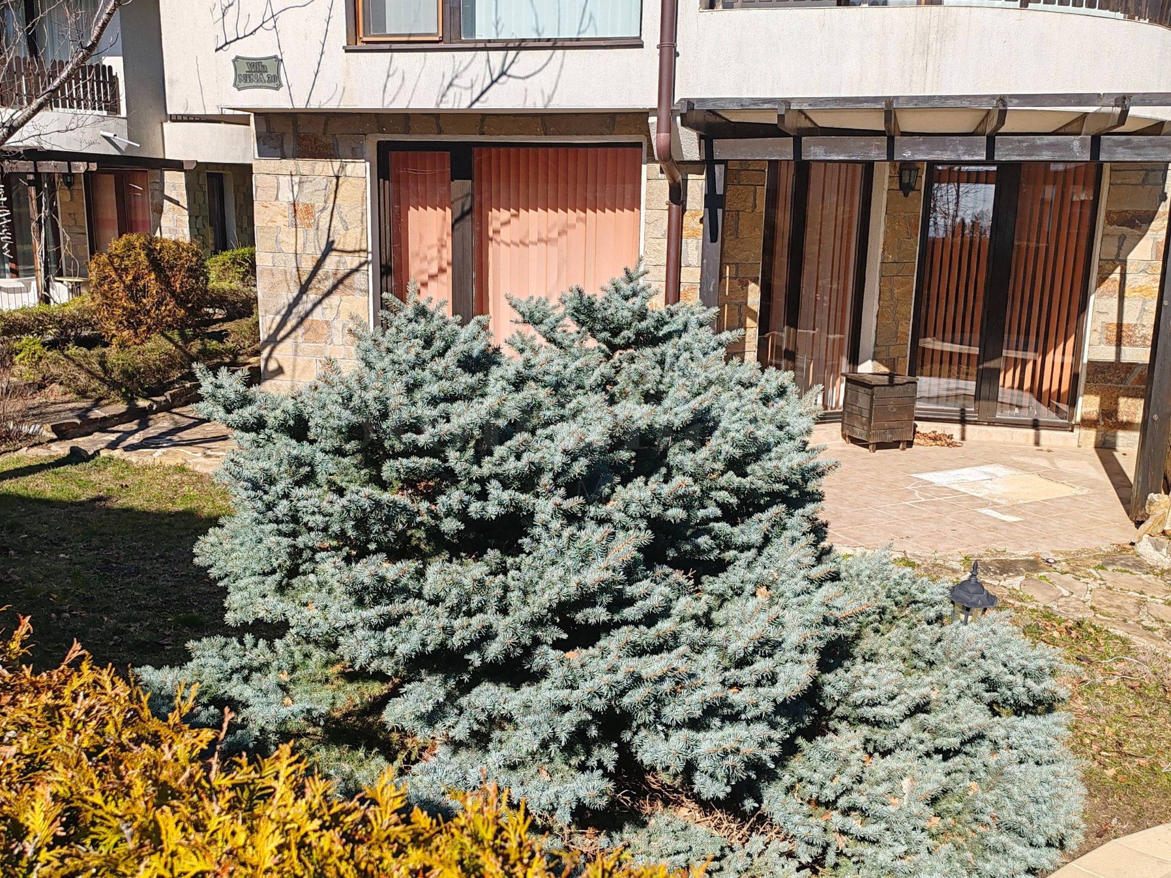 verandă.Apartamentul este mobilat, se vinde cu mobilierul și aparatele existente, este gata pentru mutare sau pentru închiriere. Locuința are acces la o piscină privată, o grădină mare cu pomi fructiferi și multe flori.