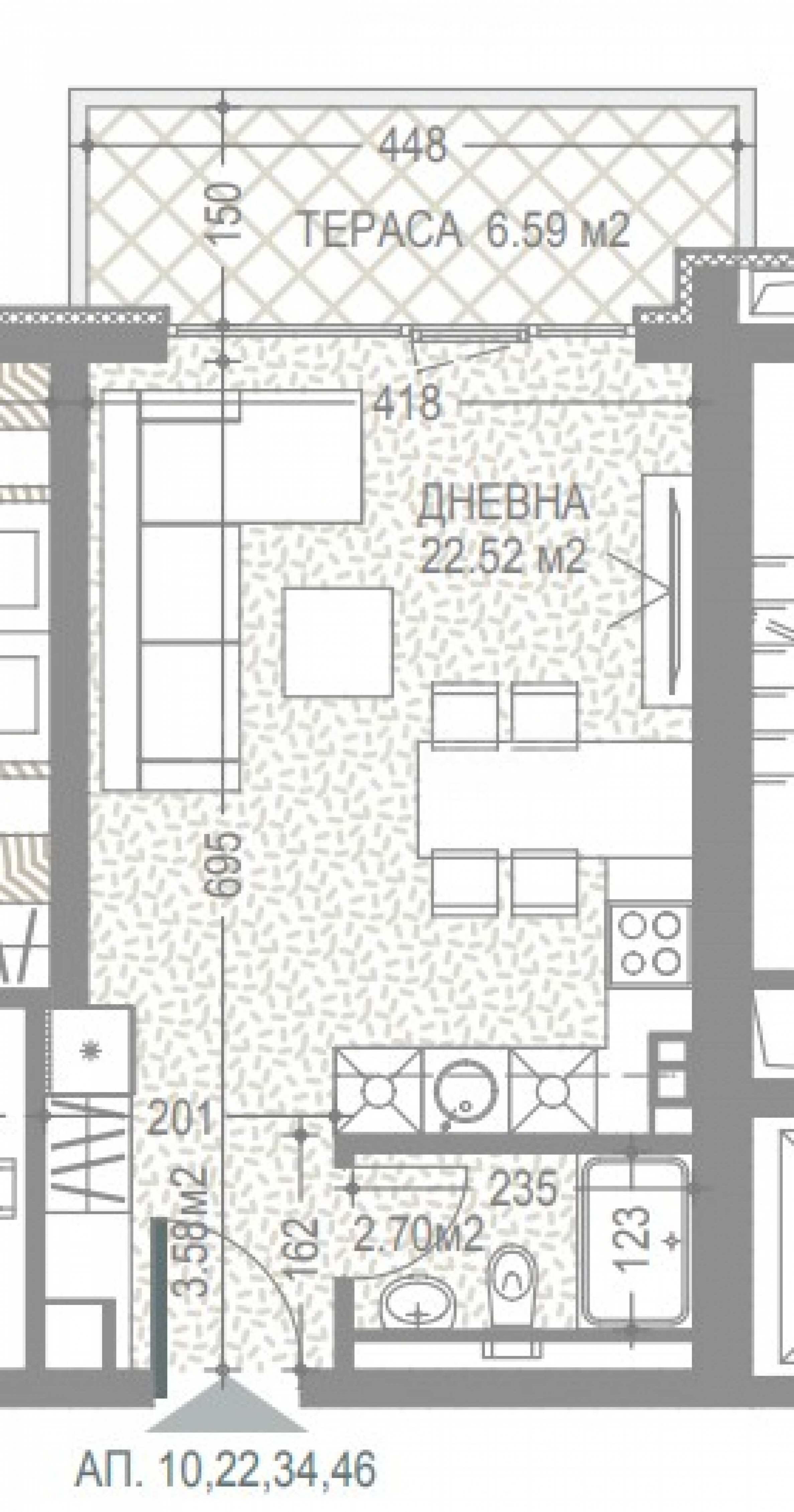 Apartamentul este situat la etajul 3 și constă din antreu, baie cu toaletă, living cu bucătărie și terasă. Proprietatea are o suprafață totală de 55,85 mp, cu un depozit de 3,28 mp.