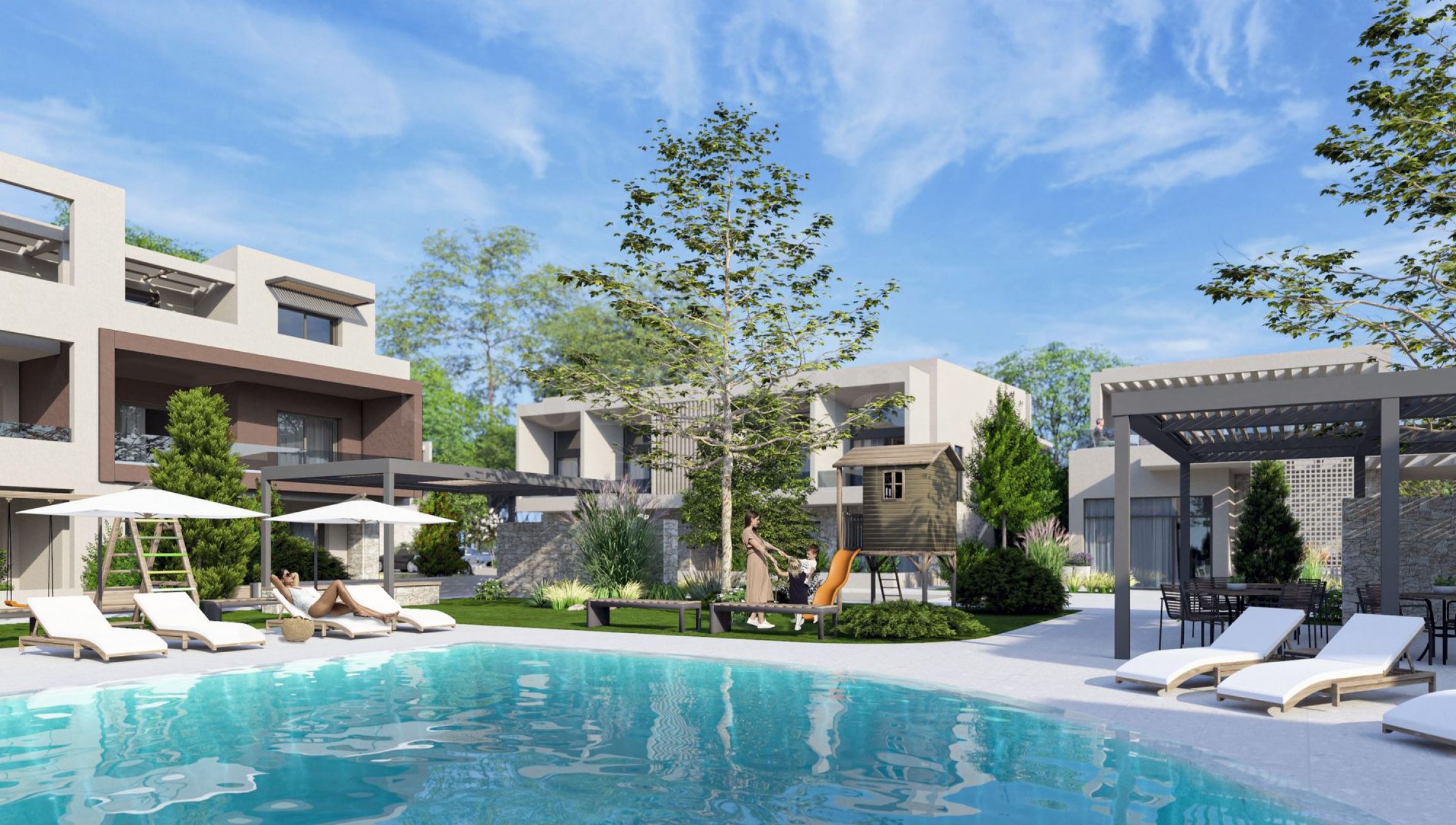 În construcția clădirilor s-au folosit materiale atent selecționate, de înaltă calitate, precum și elemente caracteristice construcțiilor moderne, cum ar fi ferestre mari și terase vitrate. În curtea complexului există detalii speciale din piatră și o amenajare peisagistică minuțioasă, creând o atmosferă ideală pentru relaxare. O piscină exterioară mare, comună, garantează răcoare și momente plăcute alături de cei dragi. În jurul piscinei veți găsi zone de relaxare, precum și un loc de joacă pentru copii, unde cei mai mici locatari se pot distra în timp ce dumneavoastră vă relaxați. Nu în ultimul rând, curtea clădirilor dispune de locuri de parcare pentru fiecare apartament, ceea ce reprezintă un mare avantaj pentru stațiunea de litoral.