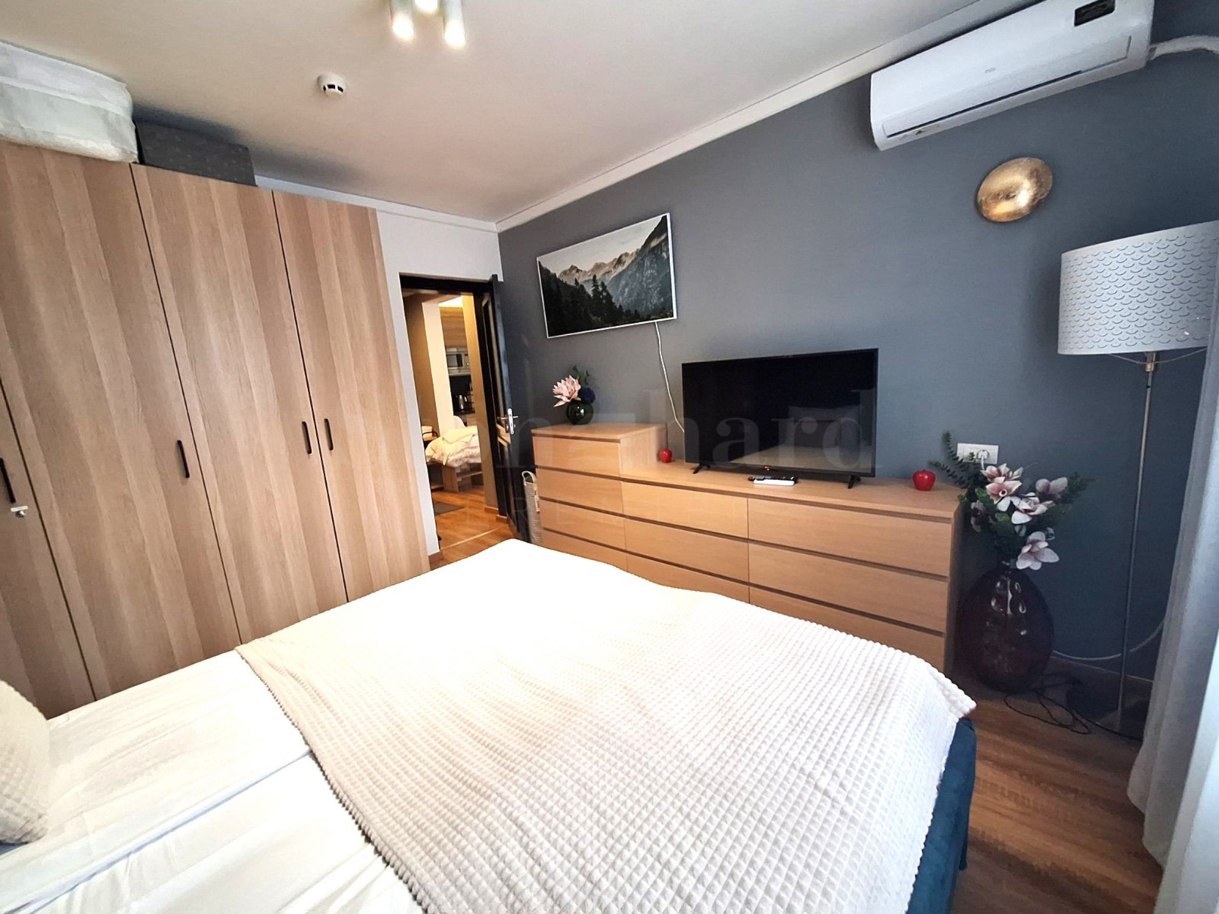 Dormitor – mobilat elegant, cu pat dublu, dulap, noptiere și televizor;