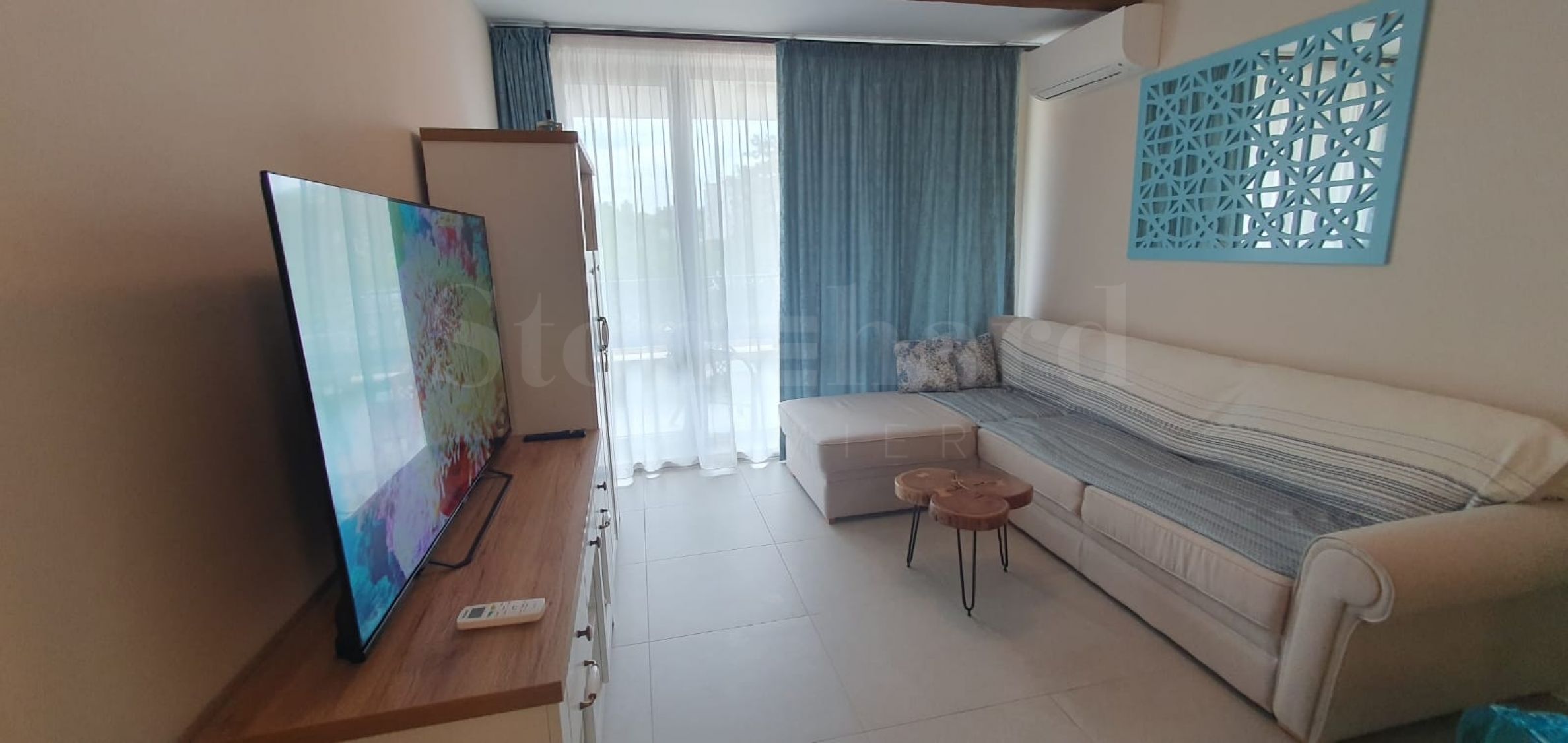 Apartamentul este mobilat recent, conform unui design individual și nu a fost închiriat. Dispune de mașină de spălat, mașină de spălat vase, cuptor, televizor, mobilier de grădină, 2 aparate de aer condiționat Daikin cu opțiune de încălzire. Obiectele sanitare din baie sunt Roca și Tres.