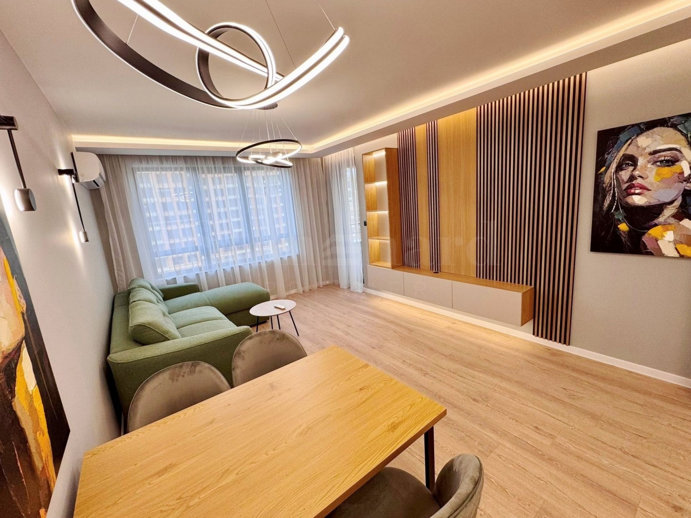 Apartamentul este complet mobilat și echipat cu tot ce este necesar, inclusiv mobilă și aparate electrice moderne. Încălzirea și răcirea sunt asigurate prin două aparate de aer condiționat inverter în fiecare cameră. Este o alegere excelentă atât pentru locuit, cât și pentru investiție.