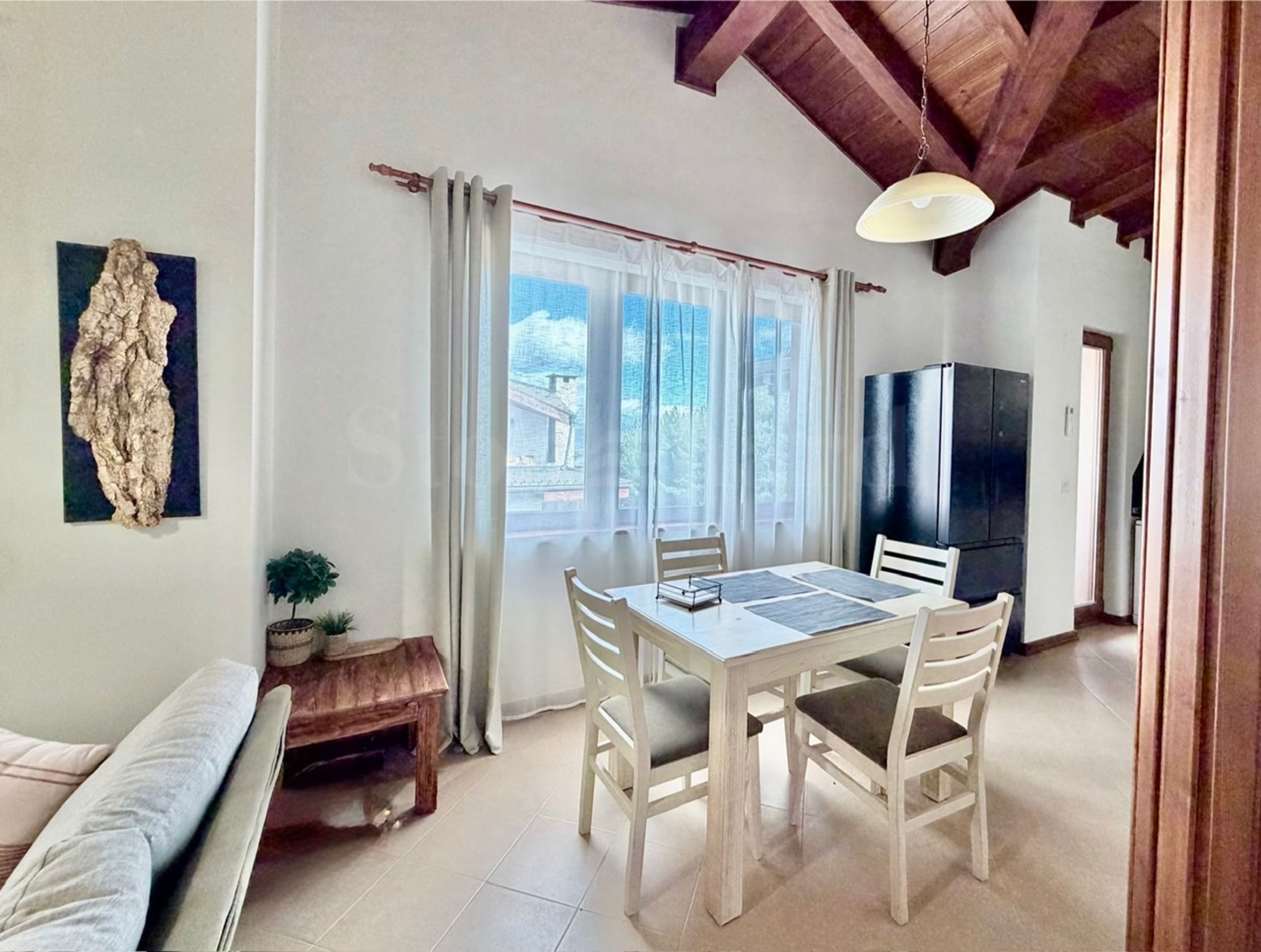 • Living cu două canapele, masă de cafea, televizor, masă de sufragerie, 4 scaune pentru luat masa, șemineu și balcon cu priveliște panoramică frumoasă;
