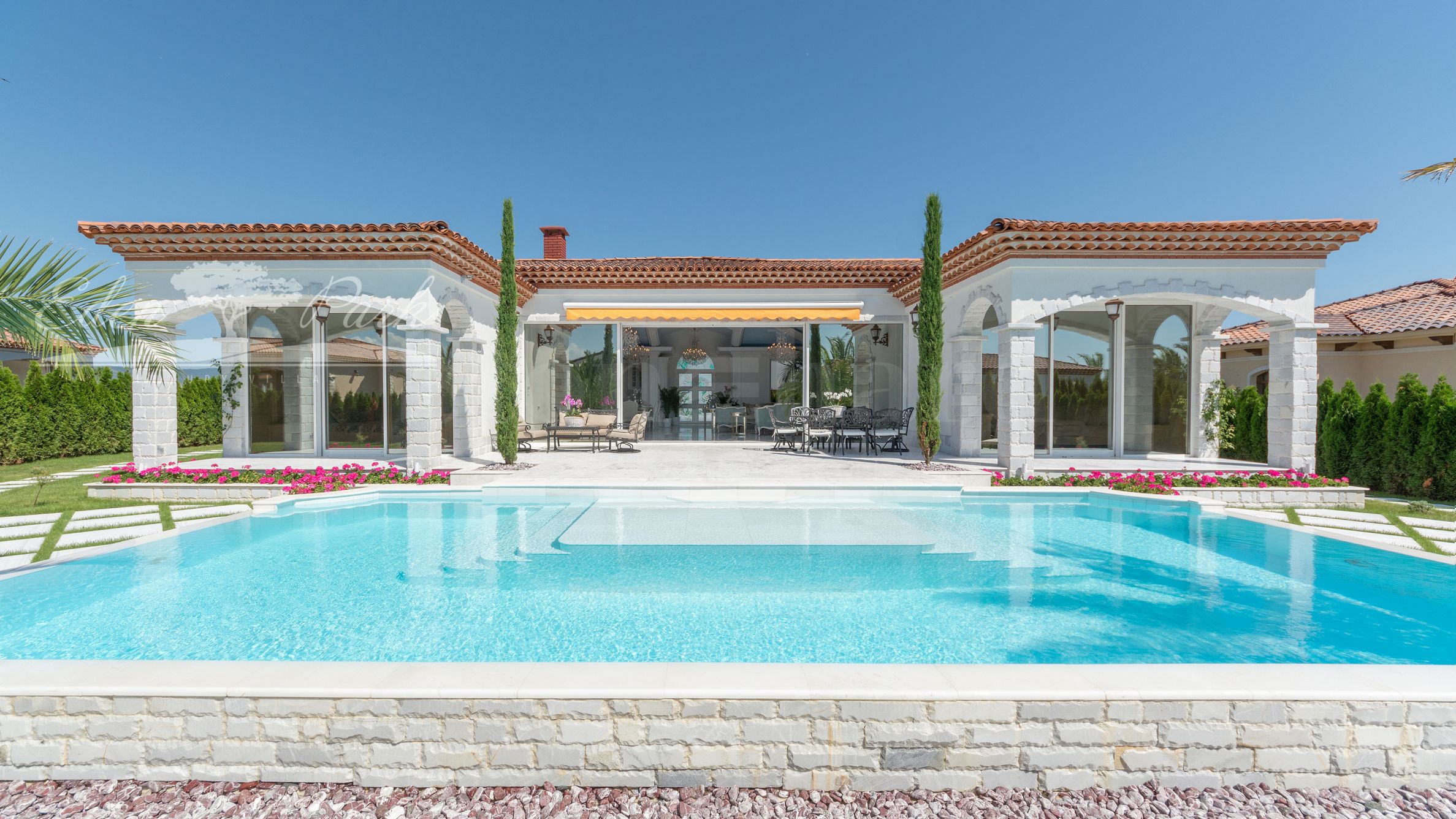 De pe verandă se iese către o piscină spațioasă, situată central în grădină și placată cu marmură naturală Pyrgos Light. Curtea este bogat amenajată cu copaci exotici și flori și dispune de zone amenajate pentru relaxare și șezlonguri.