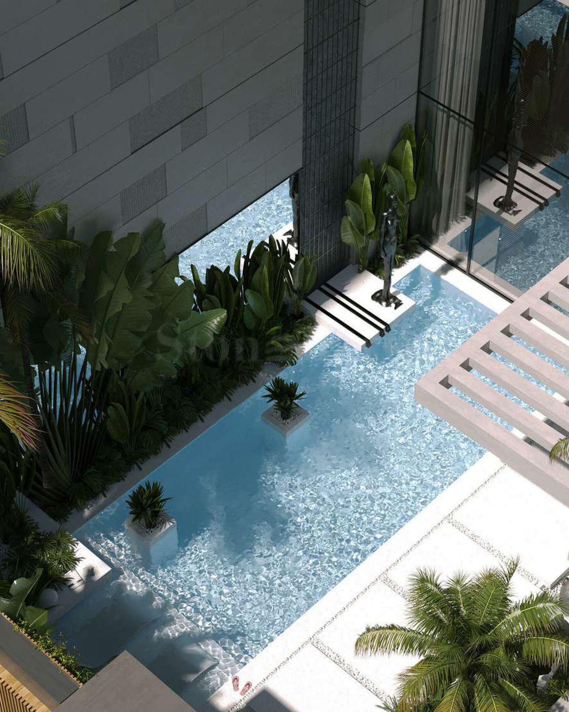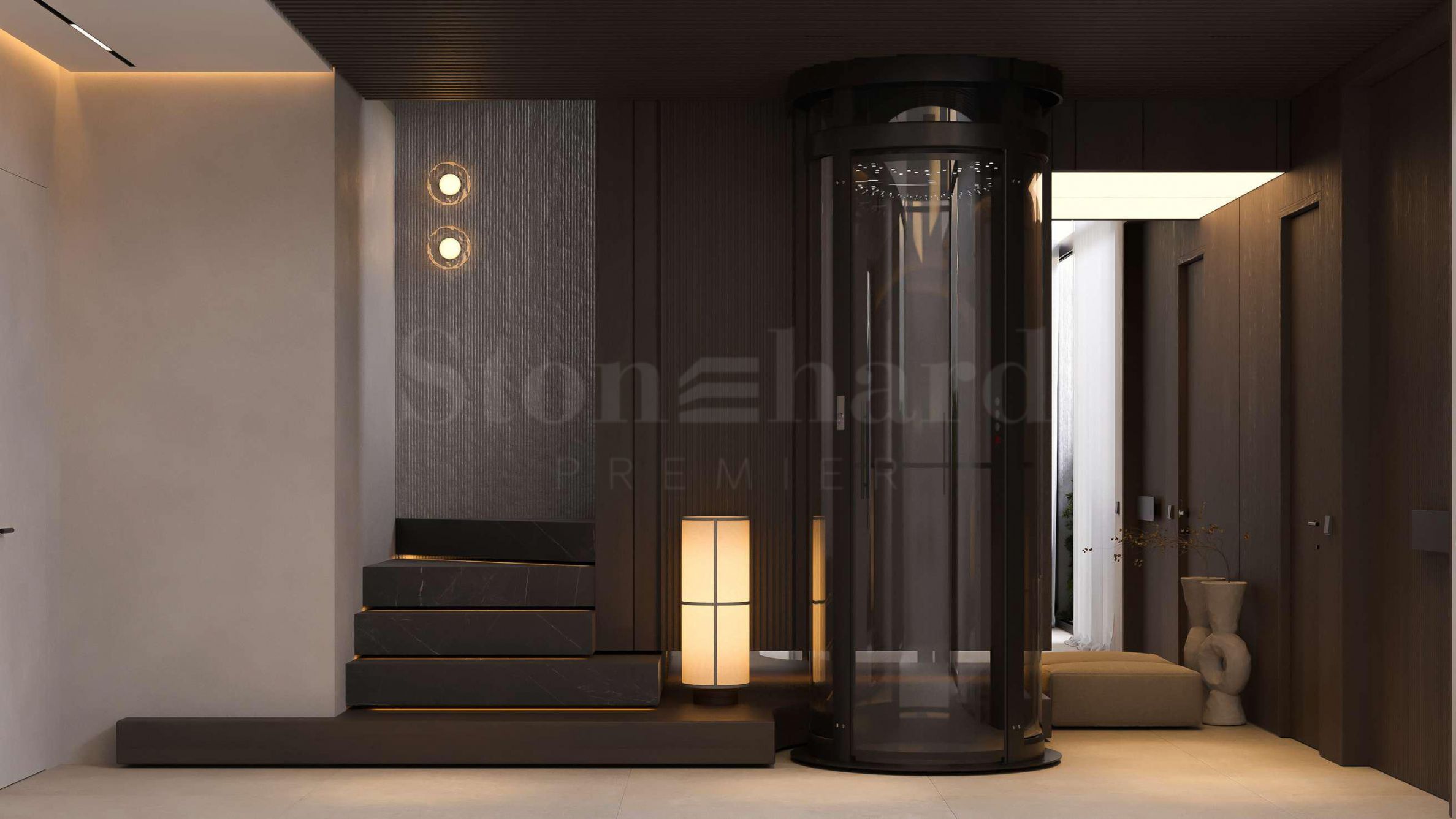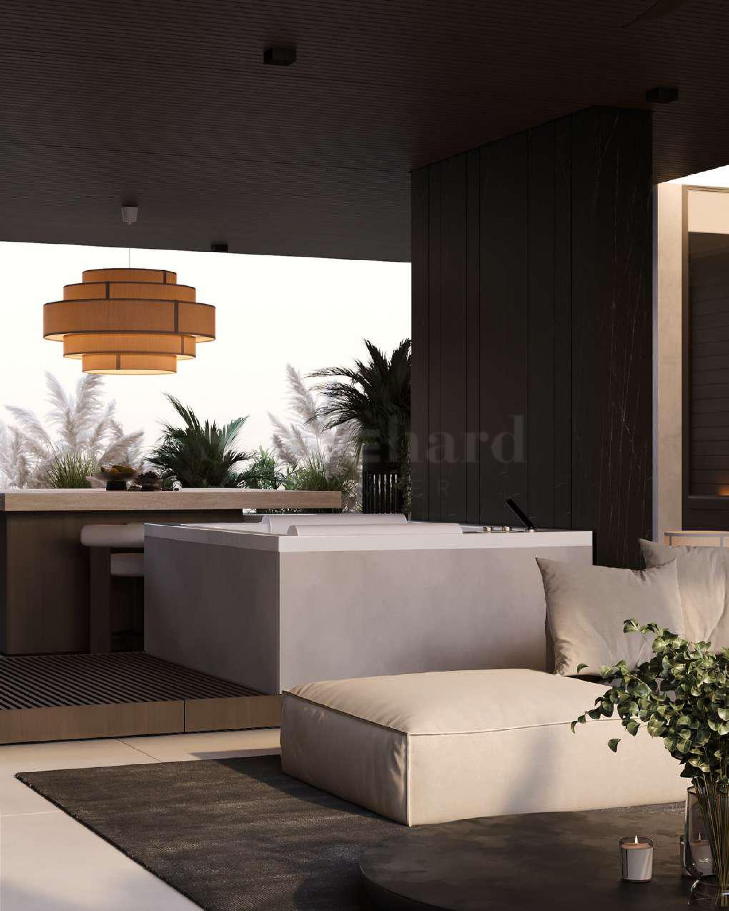 Vilele sunt pe trei niveluri și oferă o delimitare clară între spațiile sociale și cele private. La parter se află un living spațios cu bucătărie și dining open space, care trece lin către o verandă însorită cu piscină proprie și o zonă elegantă de relaxare cu șezlonguri. Al doilea nivel include două dormitoare confortabile cu băi proprii, asigurând intimitate totală. La etajul al treilea se găsește al treilea dormitor, precum și o terasă impresionantă pe acoperiș cu mobilier moale și jacuzzi – un spațiu creat pentru relaxare seara și momente împărtășite sub cerul liber. Una dintre vilele disponibile dispune și de un lift propriu – un detaliu de înaltă clasă care adaugă atât confort, cât și valoare suplimentară proprietății.