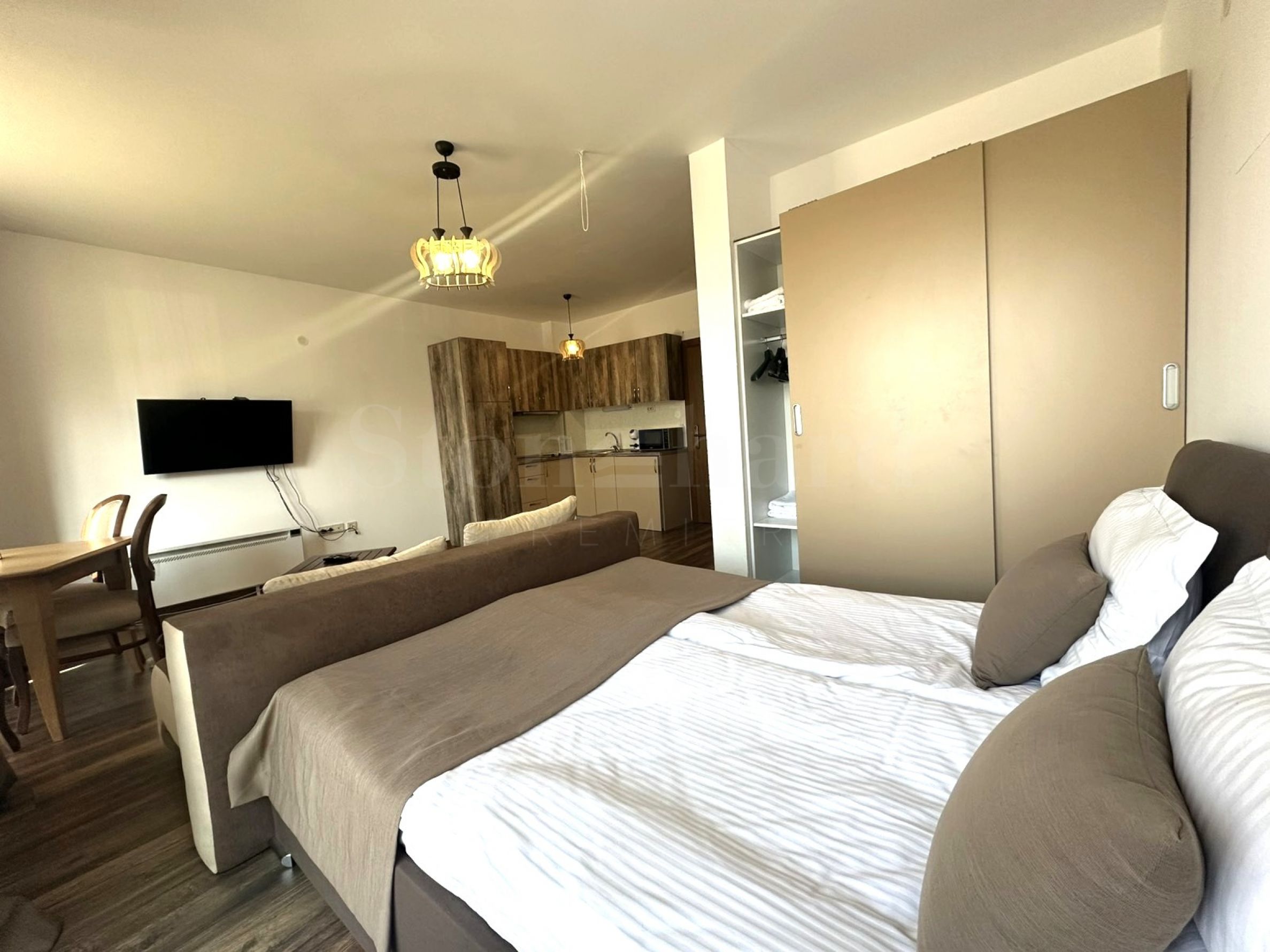 Studio-ul dispune de o compartimentare funcțională, incluzând un colț de dormit și o zonă de zi confortabilă cu mobilier moale și masă pentru luat masa.