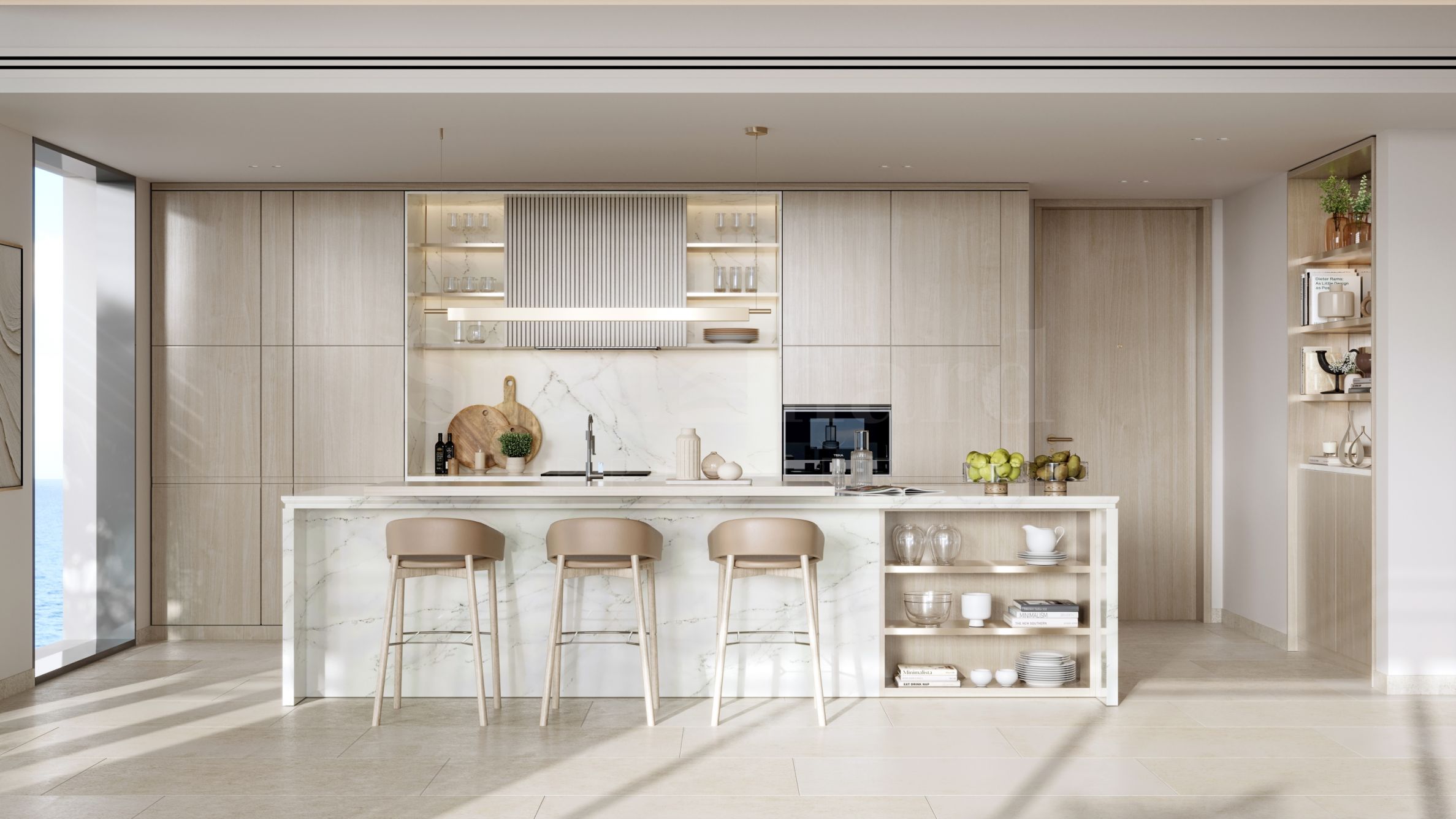 În prezent sunt disponibile un număr limitat de apartamente cu trei și patru camere, cu compartimentări funcționale și confortabile. Livingurile spațioase trec lin în bucătării și sufragerii, creând spații deschise ideale pentru momente petrecute împreună, iar fiecare dormitor dispune de baie proprie pentru confort și intimitate suplimentară. Tavanele înalte și ferestrele franceze de la podea până în tavan permit o abundență de lumină naturală și oferă priveliști impresionante – spre albastrul infinit al mării sau spre insula pitorească. Apartamentele sunt predate finisate „la cheie”, inclusiv uși de intrare și interioare, pardoseli, iluminat, bucătării complet echipate și băi finisate cu stil.