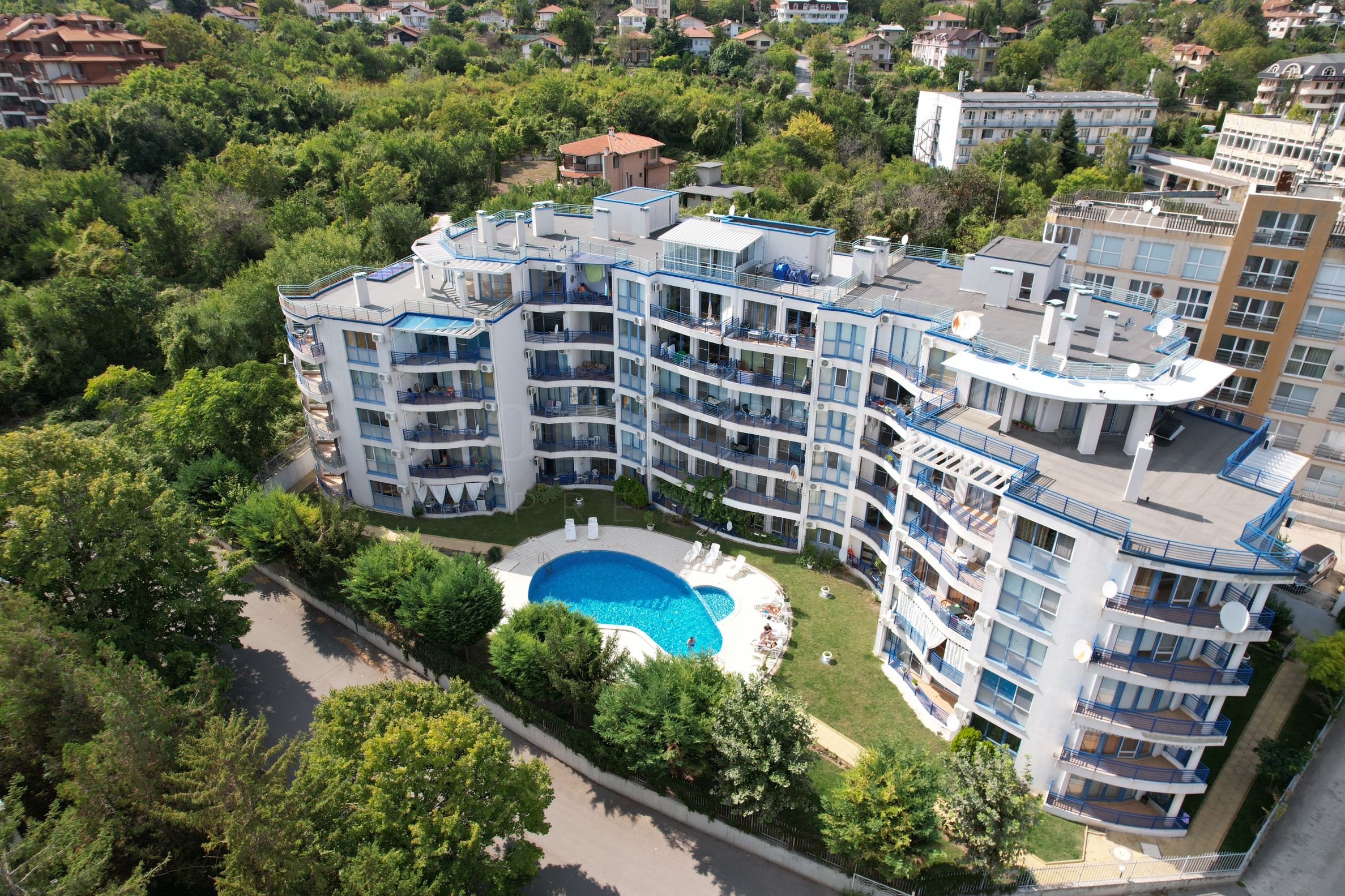 Complexul în care este situată proprietatea oferită constă din două clădiri oglindă, construite pe un teren de 2950 mp. Numărul total de apartamente este 84, iar facilitățile suplimentare includ piscină în aer liber, centru de fitness și bar.